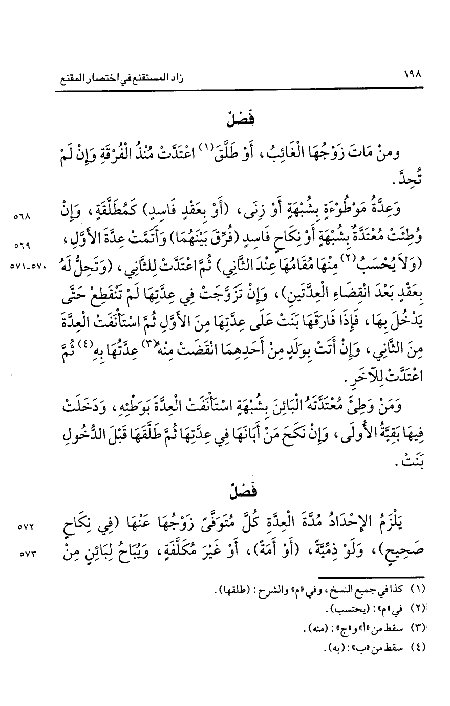 يلزم الاحداد مدة العدة كل متوفى زوجها عنها "في نكاح صحيح" ولو ذمية "أو أمة" أو غير مكلفة ويباح لبائن من