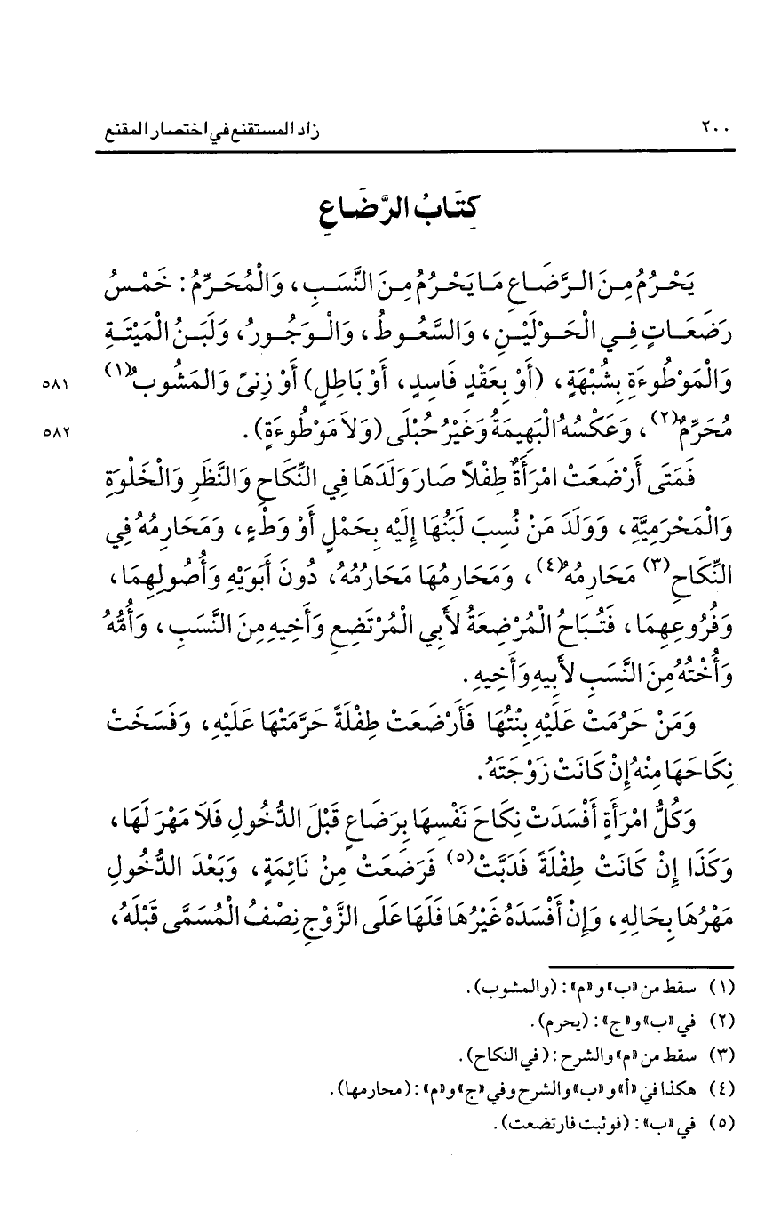 يحرم من الرضاع ما يحرم من النسب والمحرم: خمس رضعات في الحولين والسعوط والوجور ولبن الميتة والموطوءة بشبهة "أو بعقد فاسد أو باطل" أو زنا والمشوب1 محرم2 وعكسه البهيمة وغير حبلى "ولا موطوءة".