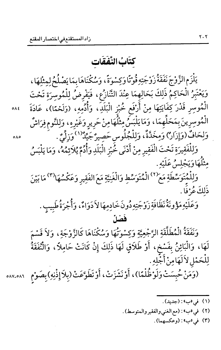 يلزم الزوج نفقة زوجته قوتا وكسوة وسكناها بما يصلح لمثلها ويعتبر الحاكم ذلك بحالهما عند التنازع فيفرض للموسرة تحت الموسر قدر كفايتها من أرفع خبز البلد وأدمه "ولحما" عادة الموسرين بمحلهما وما يلبس مثلها من حرير وغيره وللنوم فراش ولحاف "وإزار" ومخدة وللجلوس حصير جيد1 وزلي.