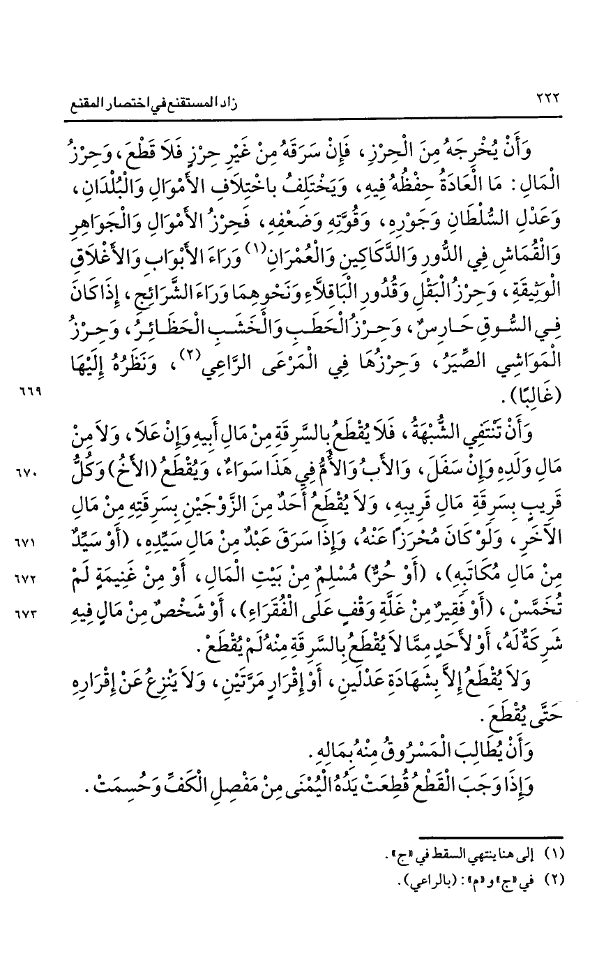 وأن يخرجه من الحرز فإن سرقه من غير حرز فلا قطع وحرز المال: ما العادة حفظه فيه ويختلف باختلاف الأموال والبلدان وعدل السلطان وجوره وقوته وضعفه فحرز الأموال والجواهر والقماش في الدور والدكاكين والعمران1 وراء الأبواب والأغلاق الوثيقة وحرز البقل وقدور الباقلاء ونحوهما وراء الشرائج إذا كان في السوق حارس وحرز الحطب والخب والحظائر وحرز المواشي الصير وحرزها في المرعى الراعي2 ونظره إليها "غالبا".