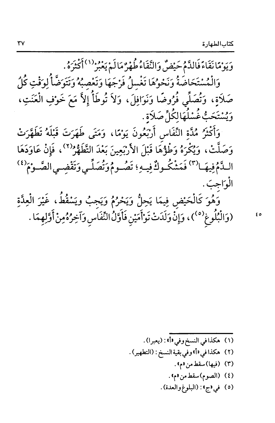 وأكثر مدة النفاس أربعون يوما ومتى طهرت قبله تطهرت وصلت ويكره وطئها قبل الأربعين بعد التطهر2 فإن عاودها الدم فيها3 فمشكوك فيه تصوم وتصلي وتقضي الصوم4 الواجب.