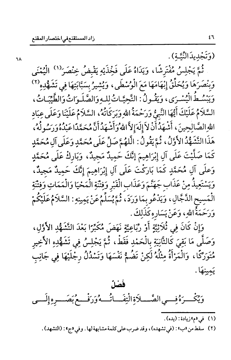 ثم يجلس مفترشا ويداه على فخذيه يقبض خنصر1 اليمنى وبنصرها ويحلق إبهامها مع الوسطى ويشير بسبابتها في تشهده2 ويبسط اليسرى ويقول: التحيات لله والصلوات والطيبات السلام عليك أيها النبي ورحمة الله وبركاته السلام علينا وعلى عباد الله الصالحين أشهد أن لا إله إلا الله وأشهد أن محمدا عبده ورسوله هذا التشهد الأول ثم يقول اللهم صل على محمد وعلى آل محمد كما صليت على إبراهيم إنك حميد مجيد وبارك على محمد وعلى آل محمد كما باركت على آل إبراهيم إنك حميد مجيد ويستعيذ من عذاب جهنم وعذاب القبر وفتنة المحيا والممات وفتنة المسيح الدجال ويدعو بما ورد ثم يسلم عن يمينه: السلام عليكم ورحمة الله وعن يساره كذلك.