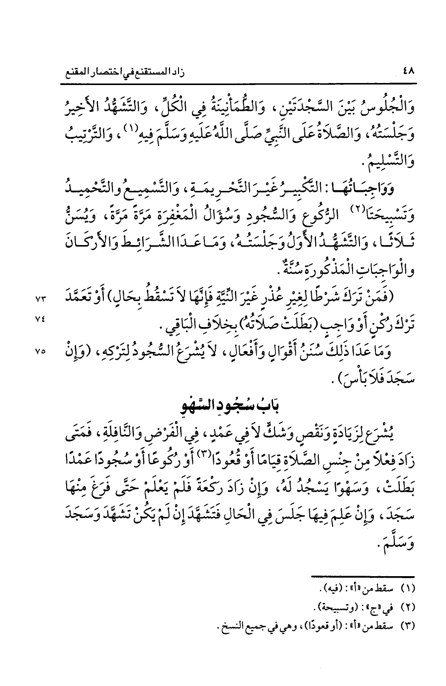 وواجباتها: التكبير غير والتحريمة والتسميع والتحميد وتسبيحتا2 الركوع والسجود وسؤال المغفرة مرة مرة ويسن ثلاثا والتشهد الأول وجلسته وما عدا الشرائط والأركان والواجبات المذكورة سنة.