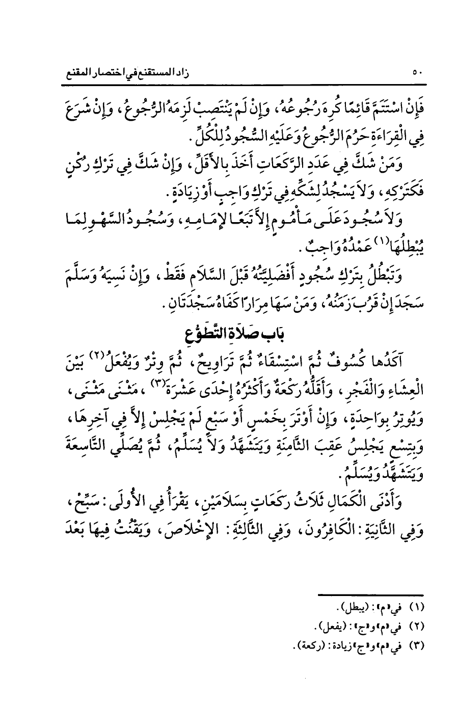 وأدنى الكمال ثلاث ركعات بسلامين يقرأ في الأولى: سبح, وفي الثانية: الكافرون وفي الثالثة: الإخلاص ويقنت فيها بعد