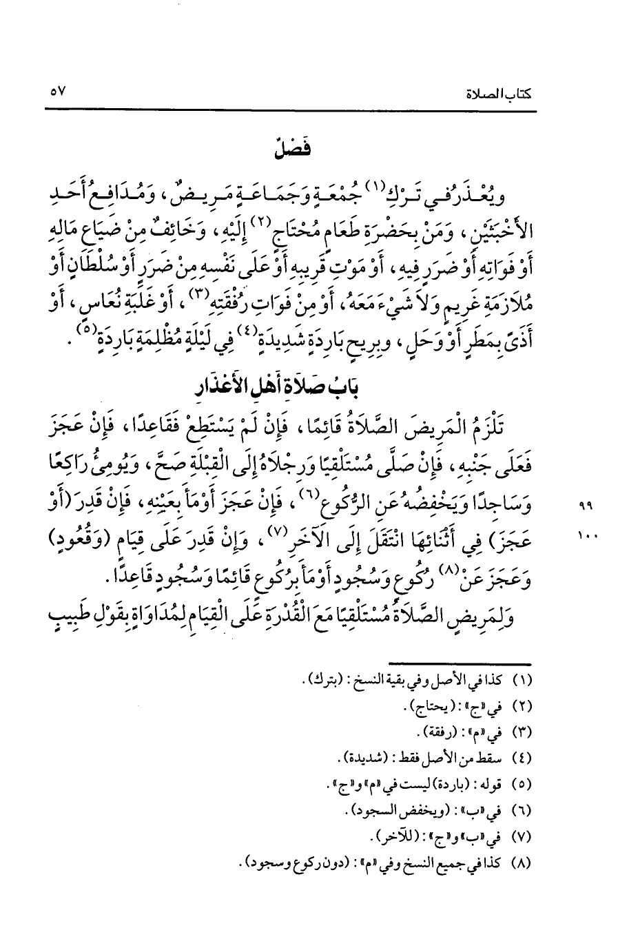 وبعذر في ترك1 جمعة وجماعة مريض ومدافع أحد الأخبثين ومن بحضرة طعام محتاج2 إليه وخائف من ضياع ماله أو فواته أو ضرر فيه أو موت قريبه أو على نفسه من ضرر أو سلطان أو من ملازمة غريم ولا شيء معه أو من فوات رفقته3 أو غلبة نعاس أو أذى بمطر ووحل وبريح باردة شديدة4 في ليلة مظلمة باردة5.