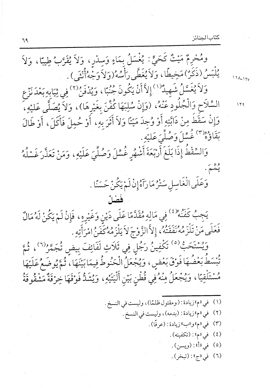 ومحرم ميت كحي: يغسل بماء وسدر ولا يقرب طيبا ولا يلبس "ذكر" مخيطا ولا يغطى رأسه "ولا وجه أنثى".