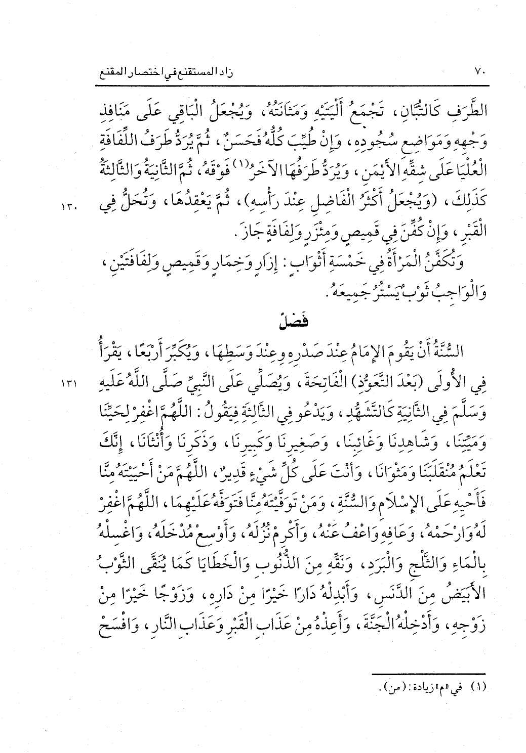 والسنة أن يقوم الإمام عند صدره وعند وسطها ويكبر أربعا يقرأ في الأولى "بعد التعوذ" الفاتحة ويصلي على النبي صلى الله عليه وسلم في الثانية كالتشهد ويدعو في الثالثة فيقول: اللهم اغفر لحينا وميتنا وشاهدنا وغائبنا وصغيرنا وكبيرنا وذكرنا وأنثانا إنك تعلم منقلبنا ومثوانا وأنت على كل شيء قدير اللهم من أحييته منا فأحيه على الإسلام والسنة ومن توفيته منا فتوفه عليهما اللهم اغفر له وارحمه وعافه واعف عنه وأكرم نزله وأوسع مدخله واغسله بالماء والثلج والبرد ونقه من الذنوب والخطايا كما ينقى الثوب الأبيض من الدنس وأبدله دارا خيرا من داره وزوجا خيرا من زوجه وأدخله الجنة وأعذه من عذاب القبر وعذاب النار وأفسح