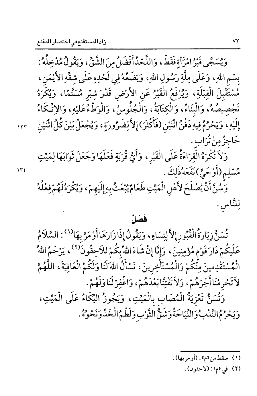 تسن زيارة القبور إلا للنساء ويقول إذا زارها أو مر بها1: السلام عليكم دار قوم مؤمنين وإنا إن شاء الله بكم للاحقون2 يرحم الله المستقدمين منكم والمستأخرين نسأل الله لنا ولكم العافية اللهم لا تحرمنا أجرهم ولا تفتنا بعدهم واغفر لنا ولهم.