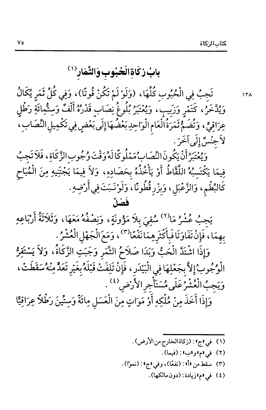 تجب في الحبوب كلها "ولو لم تكن قوتا" وفي كل ثمر يكال ويدخر كتمر وزبيب ويعتبر بلوغ نصاب قدره ألف وستمائة رطل عراقي وتضم ثمرة العام الواحد بعضها إلى بعض في تكميل النصاب لا جنس إلى آخر.
