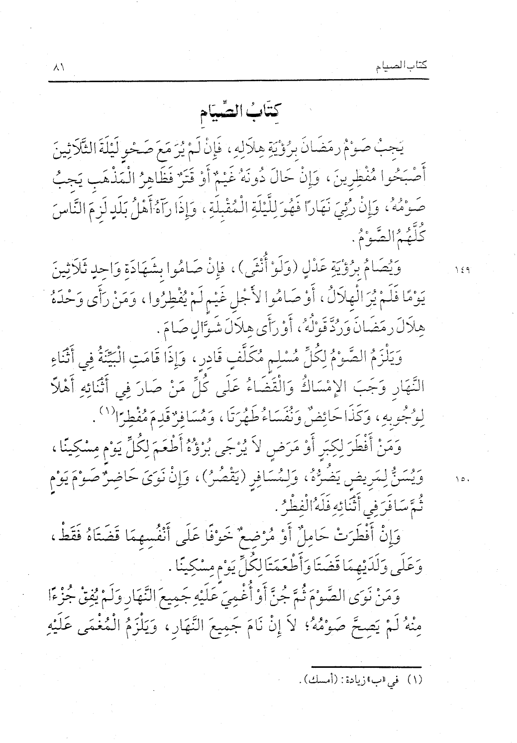 ويلزم الصوم لكل مسلم مكلف قادر وإذا قامت البينة في أثناء النهار وجب الإمساك والقضاء على كل من صار في أثنائه أهلا لوجوبه وكذا حائض ونفساء طهرتا ومسافر قدم مفطرا1.