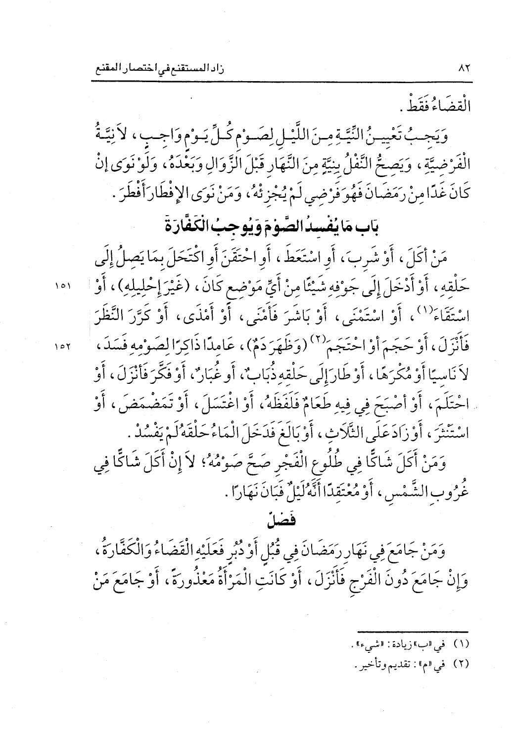 من أكل أو شرب أو استعط أو احتقن أو اكتحل بما يصل إلى حلقه أو أدخل إلى جوفه شيئا "غير إحليله" أو استقاء1 أو استمنى أو باشر فأمنى أو أمذى أو كرر النظر فأنزل أو حجم أو احتجم2 "وظهر دم" عامدا ذاكرا لصومه فسد لا ناسيا أو مكرها أو طار إلى حلقه ذباب أو غبار أو فكر فأنزل أو احتلم أو أصبح في فيه طعام فلفظه أو اغتسل أو تمضمض أو استنثر أو زاد على الثلاث أو بالغ فدخل الماء حلقه لم يفسد.