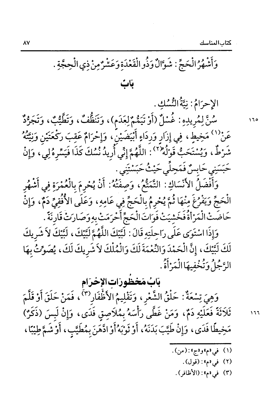 سن لمريده: غسل "أو تيمم لعدم" وتنظف وتطيب وتجرد عن1 مخيط ويحرم في إزار ورداء أبيضين وإحرام عقب ركعتين ونيته شرط ويستحب قوله2: اللهم إني أريد نسك كذا فيسره لي وإن حبسني حابس فمحلي حيث حبستني.