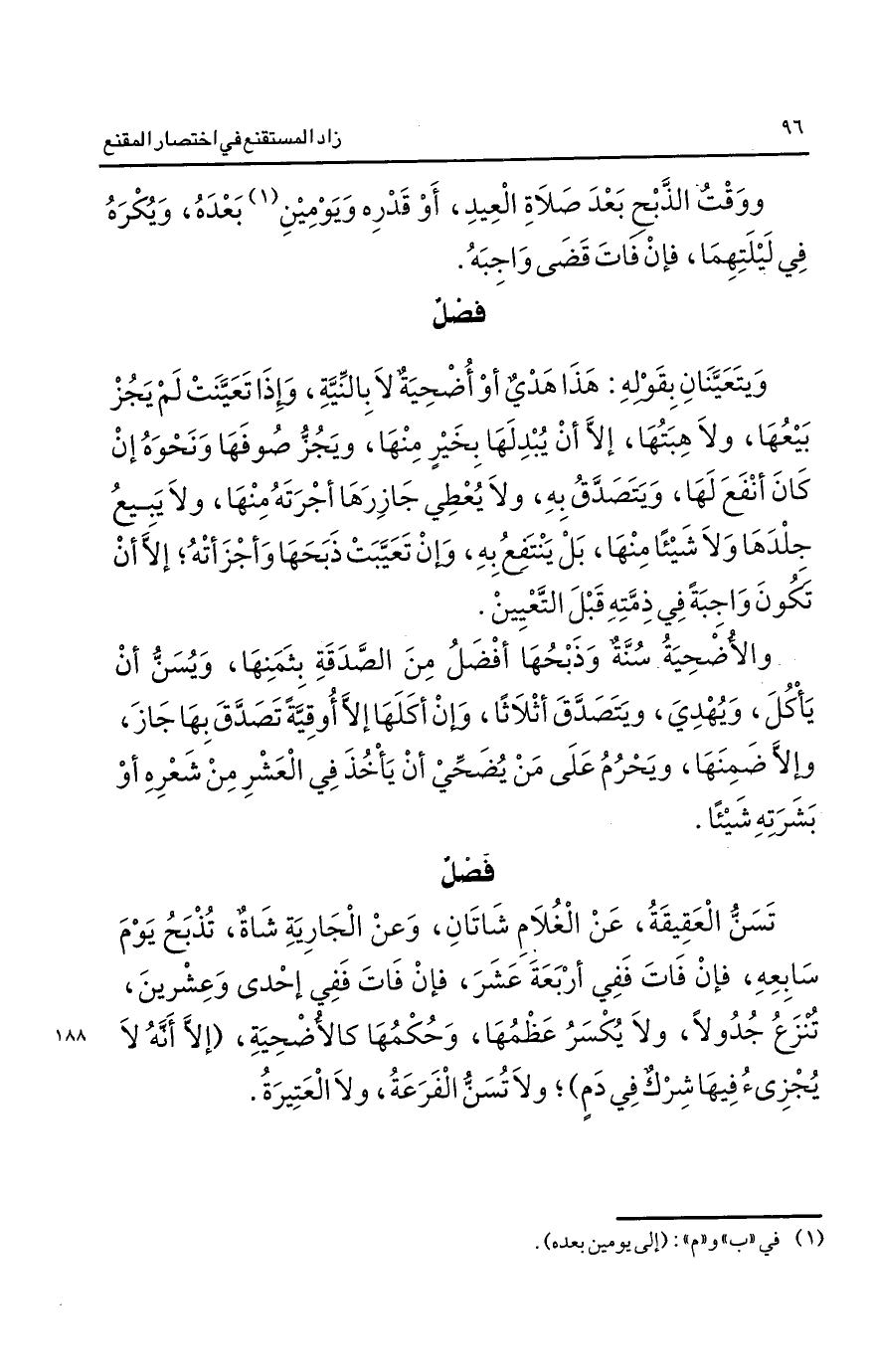 تسن العقيقة عن الغلام شاتان وعن الجارية شاة وتذبح يوم سابعه فإن فات ففي أربعة عشر فان فات ففي واحد وعشرين تنزع جدولا ولا يكسر عظمها وحكمها كالأضحية "إلا أنه لا يجزئ فيها شرك في دم" ولا تسن الفرعة ولا العتيرة.