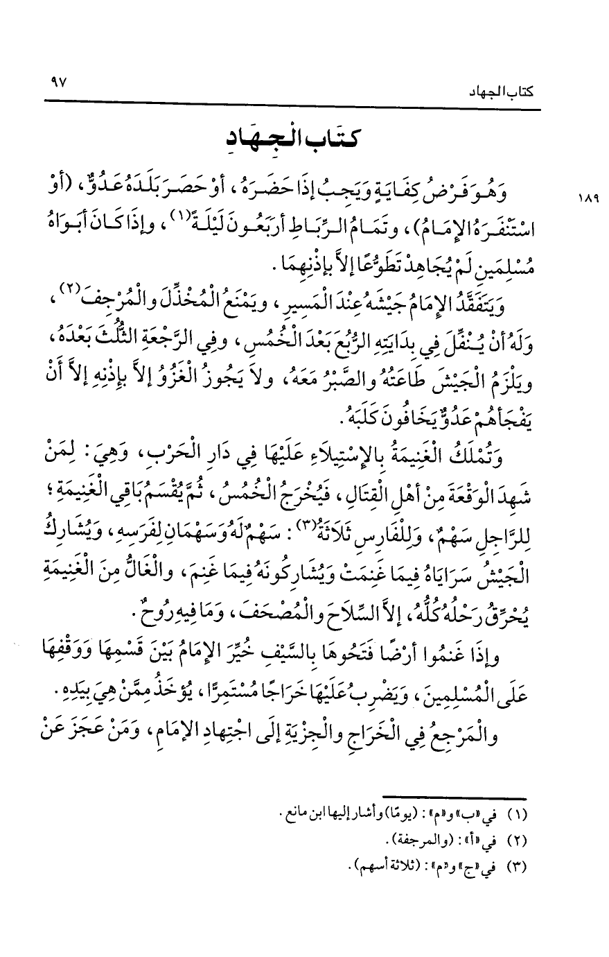 وتملك الغنيمة بالاستيلاء عليها في دار الحرب وهي لمن شهد الوقعة من أهل القتال فيخرج الخمس ثم يقسم باقي الغنيمة للراجل سهم وللفارس ثلاثة3: سهم له وسهمان لفرسه ويشارك الجيش سراياه فيما غنمت ويشاركونه فيما غنم والغال من الغنيمة يحرق رحله كله إلا السلاح والمصحف وما فيه روح.