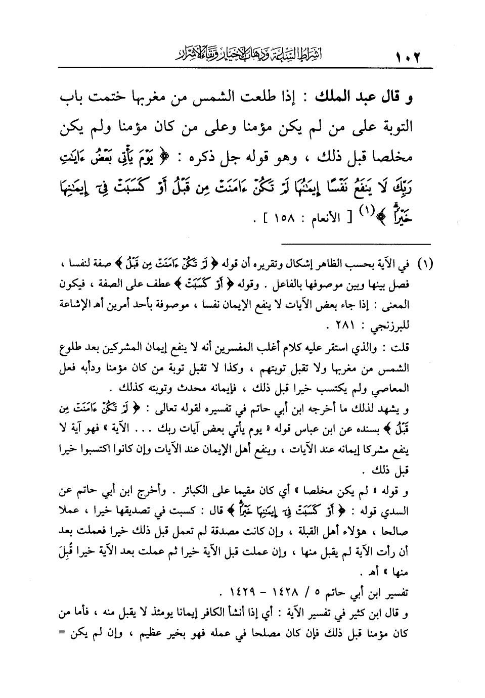 وَقَالَ عَبْدُ الْمَلِكِ: إِذَا طَلَعَتِ الشَّمْسُ مِنْ مَغْرِبِهَا خَتَمَتْ بَابَ التَّوْبَةِ عَلَى مَنْ لَمْ يَكُنْ مُؤْمِنًا وَعَلَى مَنْ كَانَ مُؤْمِنًا وَلَمْ يَكُنْ مُخْلِصًا قَبْلَ ذَلِكَ وَهُوَ قَوْلُهُ جَلَّ ذِكْرُهُ {يَوْمَ يَأْتِي بَعْضُ آيَاتِ رَبِّكَ لا يَنْفَعُ نَفْسًا إِيمَانُهَا لَمْ تَكُنْ آمَنَتْ مِنْ قَبْلُ أَوْ كَسَبَتْ فِي إِيمَانِهَا خَيْرًا} .