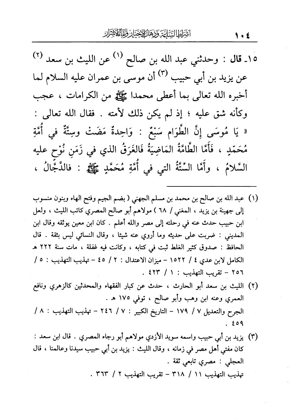 15- وَحَدَّثَنِي عَبْدُ اللَّهِ بْنُ صَالِحٍ عَنِ اللَّيْثِ بْنِ سَعْدٍ عَنْ يَزِيدَ بْنِ أَبِي حَبِيبٍ أَنَّ مُوسَى بْنَ عِمْرَانَ عَلَيْهِ السَّلامُ لَمَّا أَخْبَرَهُ اللَّهُ تَعَالَى بِمَا أَعْطَى مُحَمَّدًا صَلَّى اللَّهُ عَلَيْهِ وَسَلَّمَ مِنَ الْكَرَامَاتِ عَجِبَ وَكَأَنَّهُ شُقَّ عَلَيْهِ إِذْ لَمْ يَكُنْ ذَلِكَ لأُمَّتِهِ فَقَالَ اللَّهُ تَعَالَى يَا مُوسَى إِنَّ الطَّوَامَّ سَبْعٌ وَاحِدَةٌ مَضَتْ وَسِتَّةٌ فِي أُمَّةِ مُحَمَّدٍ، فَأَمَّا الطَّامَّةُ الْمَاضِيَةُ فَالْغَرَقُ الَّذِي فِي زَمَنِ نُوحٍ عَلَيْهِ السَّلامُ وَأَمَّا السِّتَّةُ الَّتِي فِي أمة محمد فَالدَّجَّالُ -[105]- وَيَأْجُوجُ وَمَأْجُوجُ وَطُلُوعُ الشَّمْسِ مِنْ مَغْرِبِهَا وَالدَّابَّةُ وَالدُّخَانُ وَقِيَامُ السَّاعَةِ.