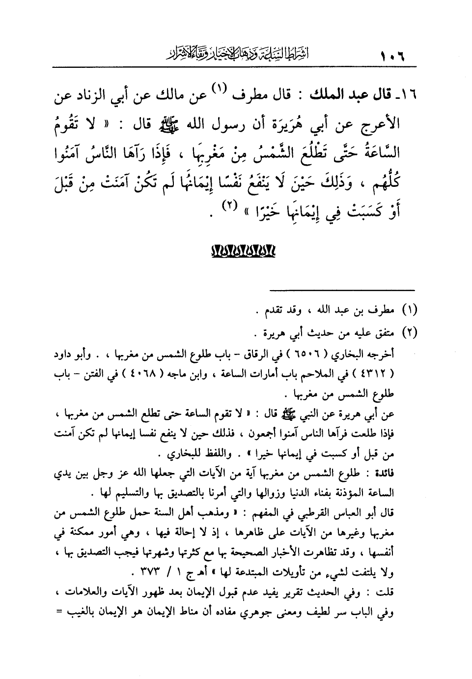 16- قَالَ عَبْدُ الْمَلِكِ: قَالَ مُطَرِّفٌ عَنْ مَالِكٍ عَنْ أَبِي الزِّنَادِ عَنِ الأَعْرَجِ , عَنْ أَبِي هُرَيْرَةَ, أَنَّ رَسُولَ اللَّهِ صَلَّى اللَّهُ عَلَيْهِ وسلم قال: لا تقوم الساعة تَطْلُعَ الشَّمْسُ مِنْ مَغْرِبِهَا , فَإِذَا رَآهَا النَّاسُ آمَنُوا كُلُّهُمْ وَذَلِكَ حِينَ لا يَنْفَعُ نَفْسًا إِيمَانُهَا لَمْ تَكُنْ آمَنَتْ مِنْ قَبْلُ أَوْ كَسَبَتْ فِي إِيمَانِهَا خَيْرًا.