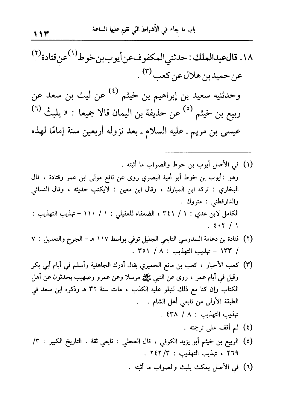 18- قَالَ عَبْدُ الْمَلِكِ: حَدَّثَنِي الْمَكْفُوفُ عَنْ أَيُّوبَ بْنِ خُوطٍ عَنْ قَتَادَةَ عَنْ حُمَيْدِ بْنِ هِلالٍ عَنْ كَعْبٍ.