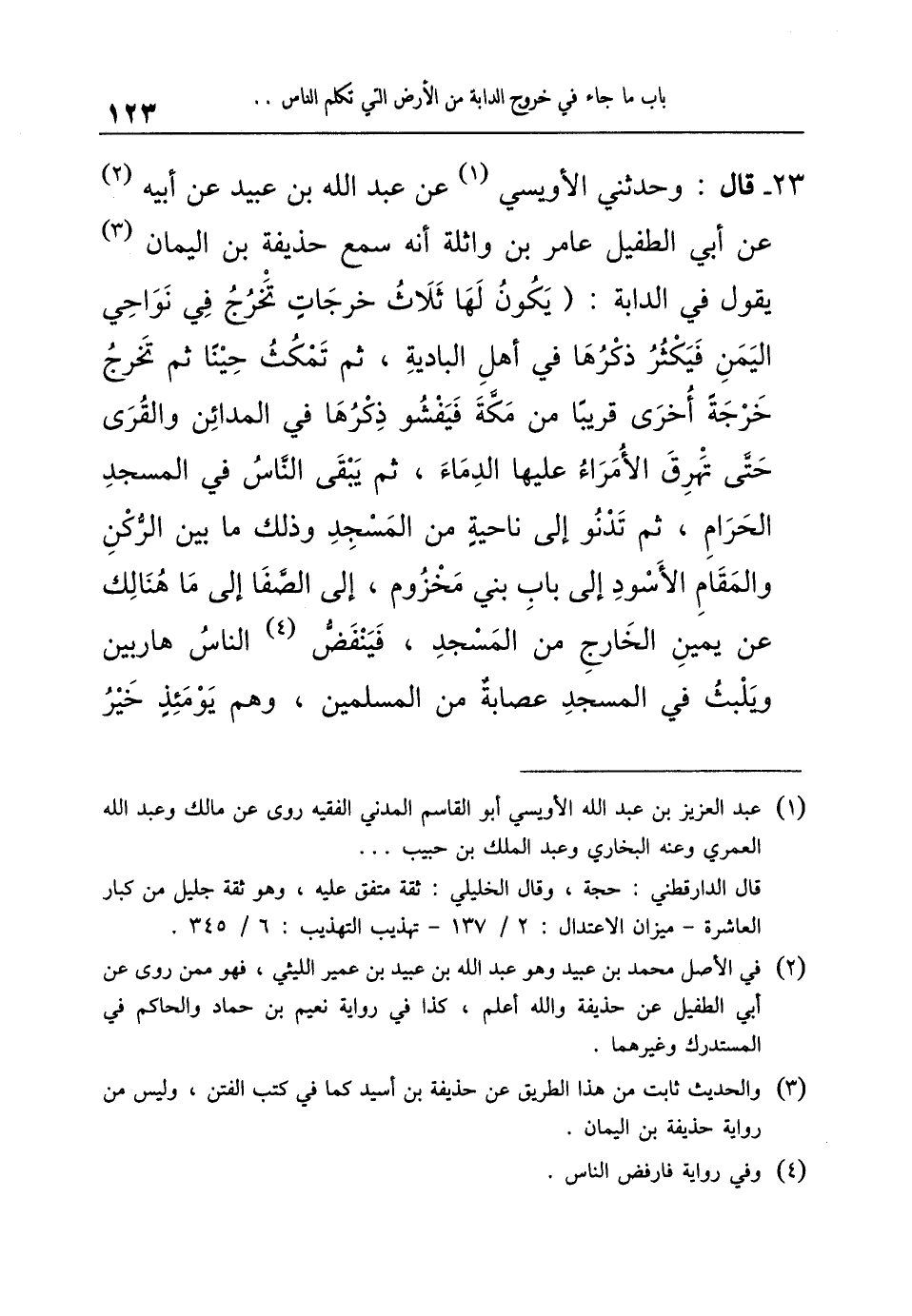 23- قَالَ: وَحَدَّثَنِي الأُوَيْسِيُّ عَنْ عَبْدِ اللَّهِ بْنِ عُبَيْدٍ , عَنْ أَبِيهِ عَنْ أَبِي الطُّفَيْلِ عَامِرِ بْنِ وَاثِلَةَ أَنَّهُ سَمِعَ حُذَيْفَةَ بْنَ الْيَمَانِ يَقُولُ فِي الدَّابَّةِ: يَكُونُ لَهَا ثَلاثُ خَرَجَاتٍ تَخْرُجُ فِي نَوَاحِيَ الْيَمَنِ فَيَكْثُرُ ذِكْرُهَا فِي أَهْلِ الْبَادِيَةِ ثُمَّ تَمْكُثُ حِينًا ثُمَّ تَخْرُجُ خَرْجَةً أُخْرَى قَرِيبًا مِنْ مَكَّةَ فَيَفْشُو ذِكْرُهَا فِي الْمَدَائِنِ وَالْقُرَى حَتَّى تُهْرِقَ الأُمَرَاءُ عَلَيْهَا الدِّمَاءَ، ثُمَّ يَبْقَى النَّاسُ فِي الْمَسْجِدِ الْحَرَامِ ثُمَّ تَدْنُو إِلَى نَاحِيَةٍ مِنَ الْمَسْجِدِ وَذَلِكَ مَا بَيْنَ الرُّكْنِ وَالْمَقَامِ الأَسْوَدِ إِلَى بَابِ بَنِي مَخْزُومٍ إِلَى الصَّفَا إِلَى مَا هُنَالِكَ عَنْ يَمِينِ الْخَارِجِ مِنَ الْمَسْجِدِ فَيَنْفَضُّ النَّاسُ هَارِبِينَ وَيَلْبَثُ فِي الْمَسْجِدِ عِصَابَةٌ مِنَ الْمُسْلِمِينَ وَهُمْ يَوْمَئِذٍ خَيْرُ -[124]- أَهْلِ الْمَسْجِدِ فَيَعْرِفُونَ أَنَّهُمْ لَمْ يُعْجَزُوا فَتَخْرُجُ الدَّابَّةُ تَنْفُضُ التُّرَابَ عَنْ رَأْسِهَا فَتَسْتَقْبِلُ الْمَشْرِقَ بِوَجْهِهَا فَتَصِيحُ صَيْحَةً يَسْمَعُهَا مَنْ فِي السَّماء وَالأَرْض مِنَ الْمَخْلُوقِينَ فِي ذَلِكَ الْوَجْهِ ثُمَّ تَسْتَقْبِلُ الْمَغْرِبَ فَتَفْعَلُ مِثْلَ ذَلِكَ ثُمَّ تَبْتَدِئُ بِتِلْكَ الْعُصْبَةِ الَّتِي فِي الْمَسْجِدِ فَتُبَشِّرُهُمْ وَتُحَدِّثُهُمْ بِمَحَاسِنِ أَعْمَالِهِمْ وَمَا لَهُمْ فِي الْجَنَّةِ مِنَ الثَّوَابِ ثُمَّ تَمْسُحُ وُجُوهَهُمْ فَتَجْلُوهَا حَتَّى تَكُونَ كَضَوْءِ الشَّمْسِ وَالْكَوَاكِبِ الدُّرِّيَّةِ.