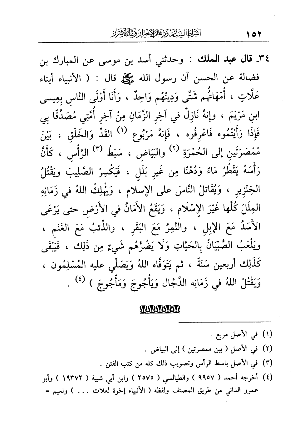 34- قَالَ عَبْدُ الْمَلِكِ: وَحَدَّثَنِي أَسَدُ بْنُ مُوسَى عَنِ الْمُبَارَكِ بْنِ فَضَالة عَنِ الْحَسَنِ أَنَّ رَسُولَ اللَّهِ صَلَّى اللَّهُ عَلَيْهِ وَسَلَّمَ قَالَ الأَنْبِيَاءُ أَبْنَاءُ عَلاتٍ أُمَّهَاتُهُمْ شَتَّى وَدِينُهُمْ وَاحِدٌ وَأَنَا أَوْلَى النَّاسِ بِعِيسَى ابْنِ مَرْيَمَ وَإِنَّهُ نَازِلٌ فِي آخِرِ الزَّمَانِ مِنْ آخِرِ أُمَّتِي مُصَدِّقًا بِي , فَإِذَا رَأَيْتُمُوهُ فَاعْرِفُوهُ فَإِنَّهُ مَرْبُوعُ الْقَدِّ وَالْخَلْقِ بَيْنَ مُمَصَّرَتَيْنِ إِلَى الْحُمْرَةِ وَالْبَيَاضِ سَبِطُ الرَّأْسِ كَأَنَّ رَأْسَهُ يَقْطُرُ مَاءً وَدُهْنًا مِنْ غَيْرِ بَلَلٍ فَيَكْسِرُ الصَّلِيبَ وَيَقْتُلُ الْخِنْزِيرَ وَيُقَاتِلُ النَّاسَ عَلَى الإِسْلامِ وَيُهْلِكُ اللَّهُ فِي زَمَانِهِ الْمِلَلَ كُلَّهَا غَيْرَ الإِسْلامِ، وَيَقَعُ الأَمَانُ فِي الأَرْضِ حَتَّى يَرْعَى الأَسَدُ مَعَ الإِبِلِ وَالنَّمِرُ مَعَ الْبَقَرِ وَالذِّئْبُ مَعَ الْغَنَمِ وَيَلْعَبُ الصِّبْيَانُ بِالْحَيَّاتِ وَلا يَضُرُّهُمْ شَيْءٌ مِنْ ذَلِكَ فَيَبْقَى كَذَلِكَ أَرْبَعِينَ سَنَةً ثُمَّ يَتَوَفَّاهُ اللَّهُ وَيُصَلِّي عَلَيْهِ الْمُسْلِمُونَ وَيَقْتُلُ اللَّهُ فِي زَمَانِهِ الدجال ويأجوج ومأجوج.