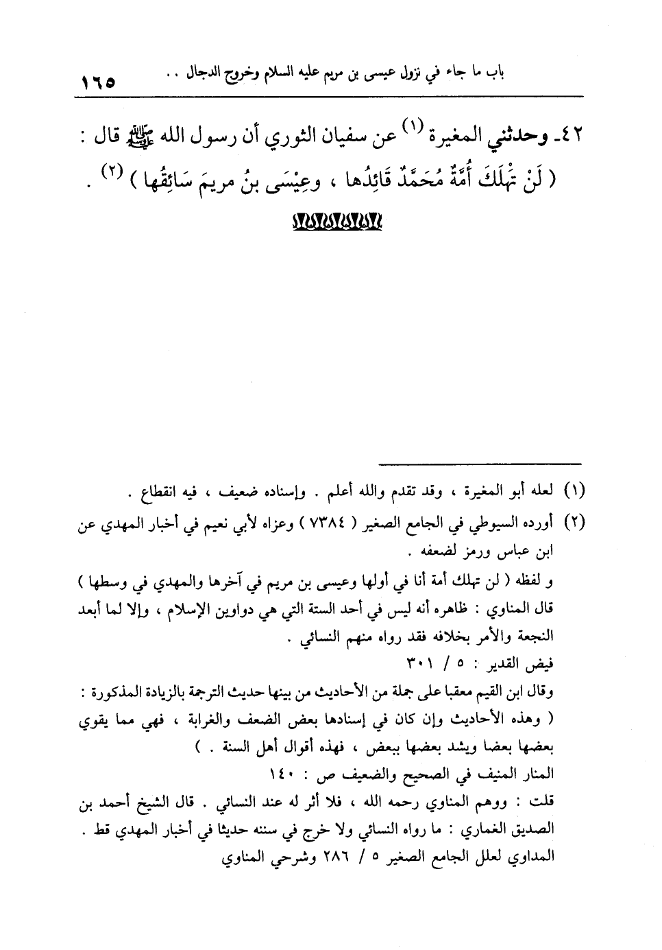 42- وَحَدَّثَنِي الْمُغِيرَةُ عَنْ سُفْيَانَ الثَّوْرِيِّ أَنَّ رَسُولَ اللَّهِ صَلَّى اللَّهُ عَلَيْهِ وَسَلَّمَ قَالَ لَنْ تهلك أمة محمد قائدها وعيسى ابْنُ مَرْيَمَ سَائِقُهَا.