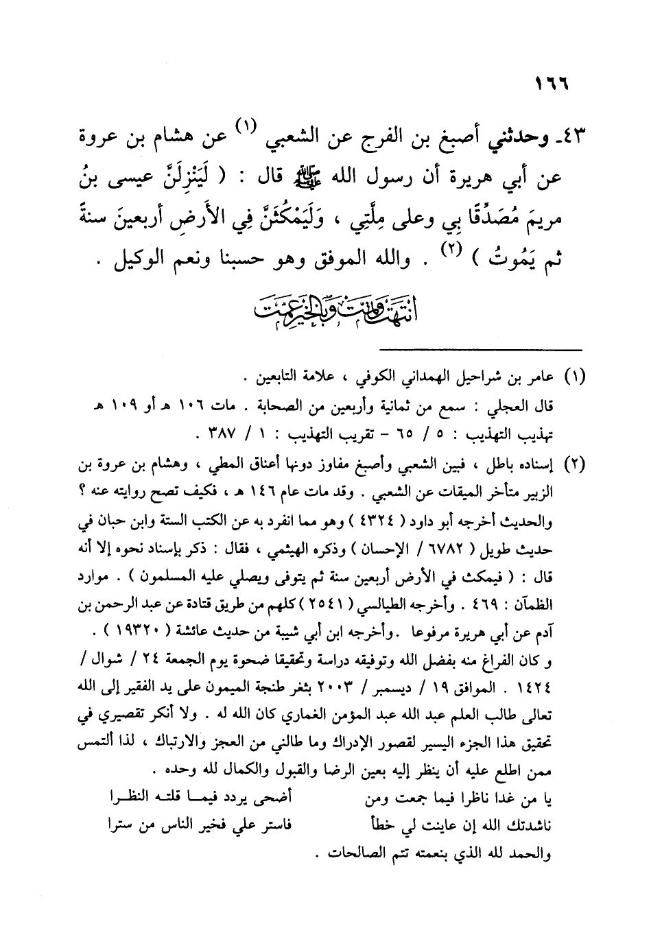 43- وَحَدَّثَنِي أَصْبَغُ بْنُ الْفَرَجِ عَنِ الشَّعْبِيِّ عَنْ هِشَامِ بْنِ عُرْوَةَ , عَنْ أَبِي هُرَيْرَةَ, أَنَّ رَسُولَ اللَّهِ صَلَّى اللَّهُ عَلَيْهِ وَسَلَّمَ قَالَ لَيَنْزِلَنَّ عِيسَى ابْنُ مَرْيَمَ مُصَدِّقًا بِي وَعَلَى مِلَّتِي وَلَيَمْكُثَنَّ فِي الأَرْضِ أَرْبَعِينَ سَنَةً ثُمَّ يَمُوتُ.