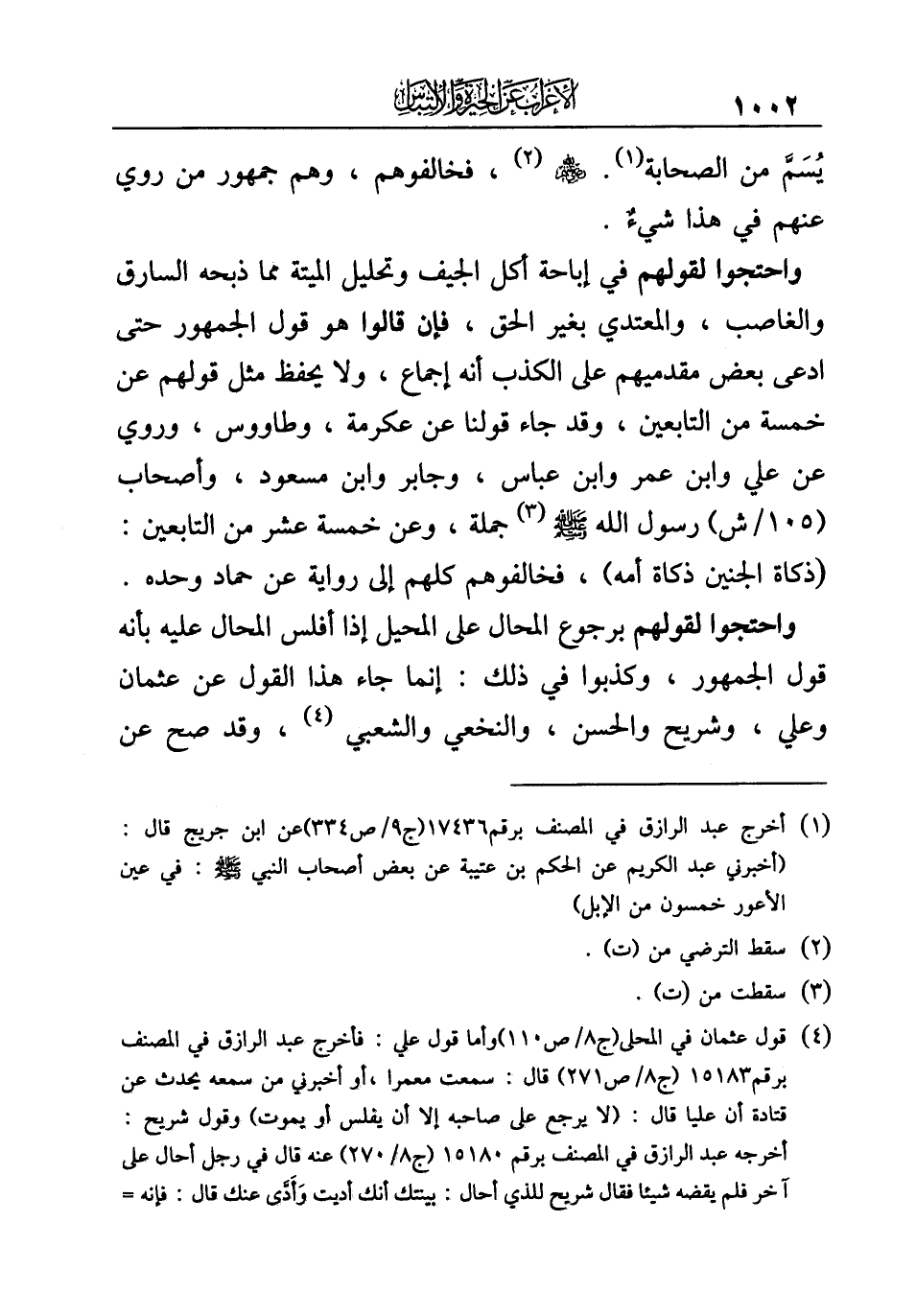 واحتجوا لقولهم في إباحة أكل الجيف وتحليل الميتة مما ذبحه السارق والغاصب، والمعتدي بغير الحق، فإن قالوا هو قول الجمهور حتى ادعى بعض مقدميهم على الكذب أنه إجماع، ولا يحفظ مثل قولهم عن خمسة من التابعين، وقد جاء قولنا عن عكرمة، وطاووس، وروي عن علي وابن عمر وابن عباس، وجابر وابن مسعود، وأصحاب رسول الله -صلى الله عليه وسلم- (¬٣) جملة، وعن خمسة عشر من التابعين: (ذكاة الجنين ذكاة أمه)، فخالفوهم كلهم إلى رواية عن حماد وحده.