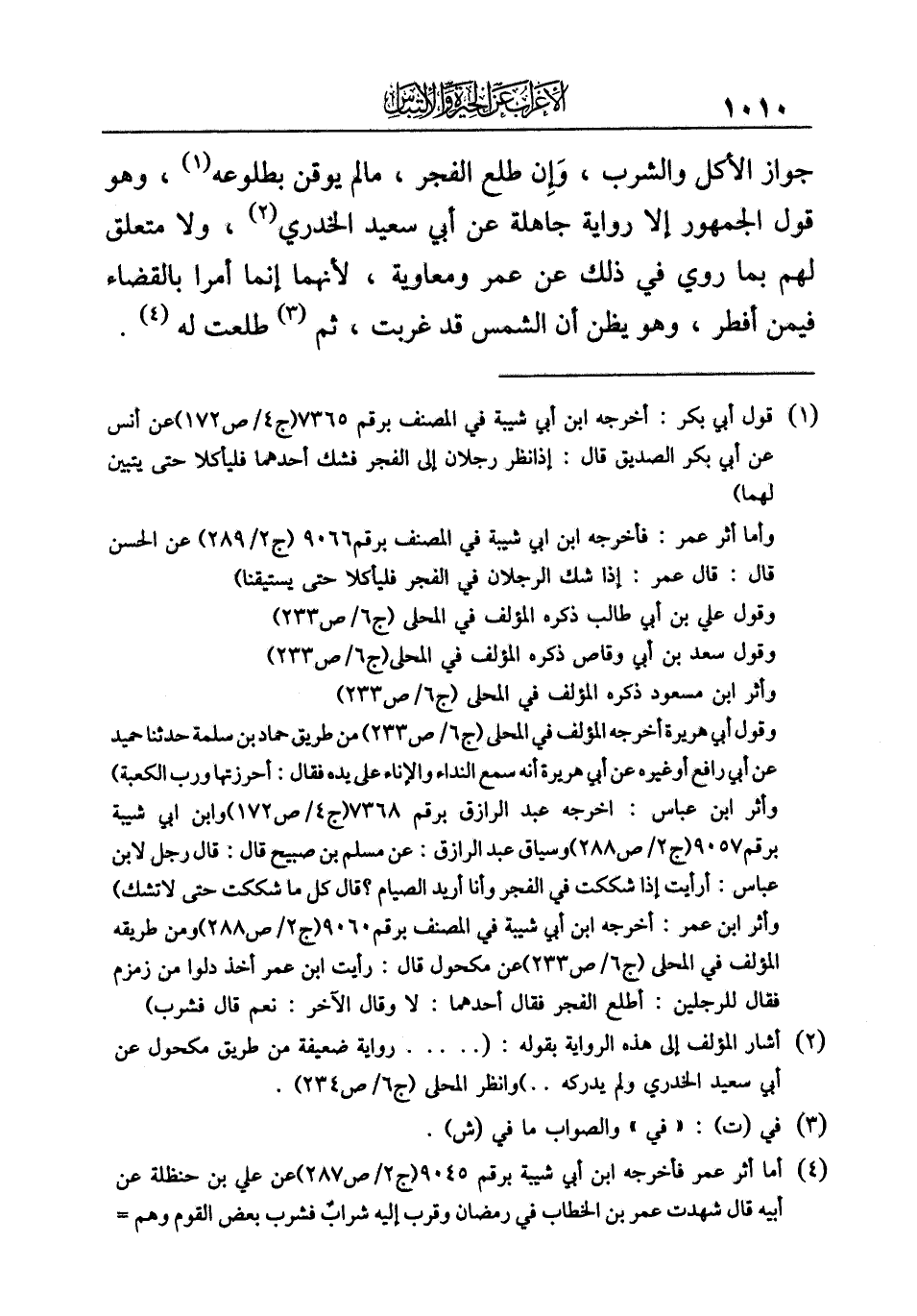 (¬١) قول أبي بكر: أخرجه ابن أبي شيبة في المصنف برقم ٧٣٦٥ (ج ٤/ ص ١٧٢) عن أنس عن أبي بكر الصديق قال: إذا نظر رجلان الى الفجر فشك أحدهما فليأكلا حتى يتبين لهما).