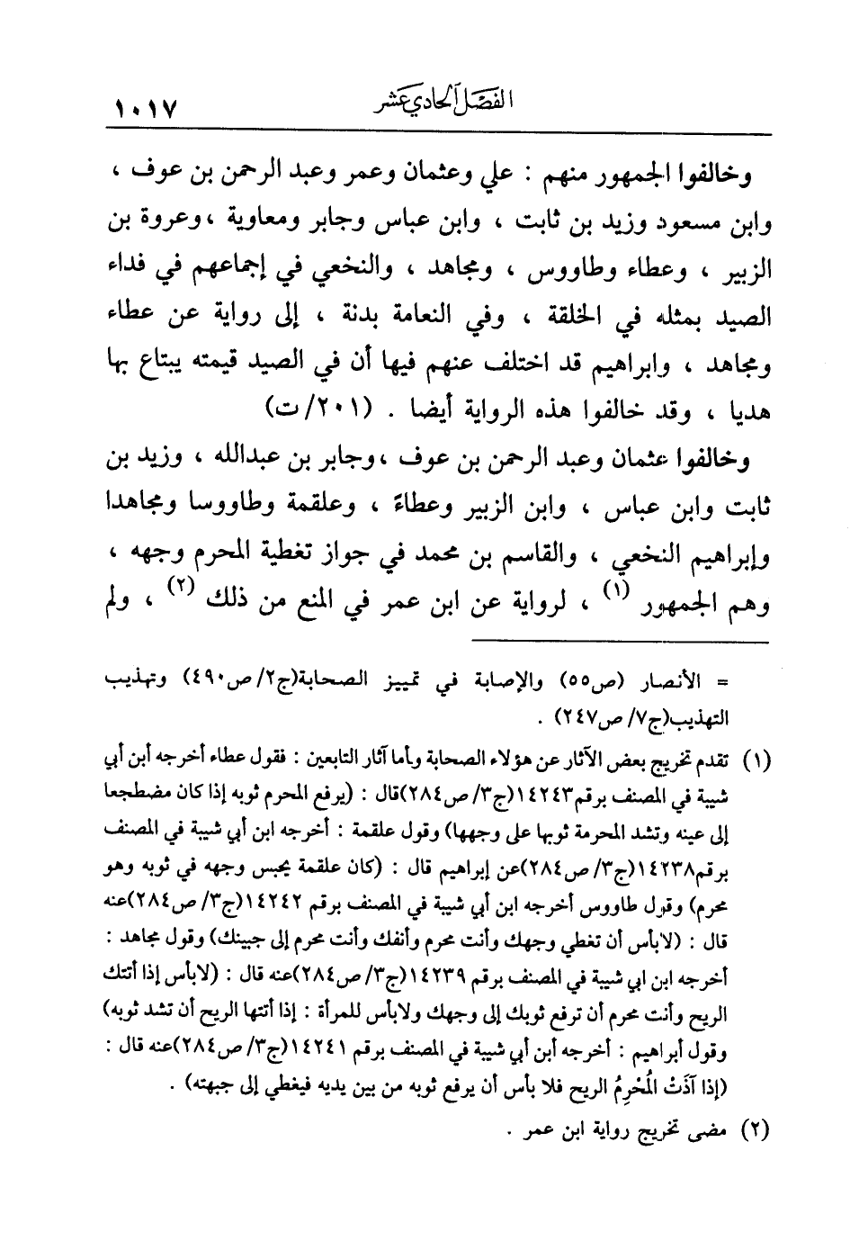 (¬١) تقدم تخريج بعض الآثار عن هؤلاء الصحابة وأما آثار التابعين: فقول عطاء أخرجه أبن أبي شيبة في المصنف برقم ١٤٢٤٣ (ج ٣/ ص ٢٨٤) قال: (يرفع المحرم ثوبه إذا كان مضطجعا إلى عينه وتشد المحرمة ثوبها على وجهها) وقول علقمة: أخرجه ابن أبي شيبة في المصنف برقم ١٤٢٣٨ (ج ٣/ ص ٢٨٤) عن إبراهيم قال: (كان علقمة يحبس وجهه في ثوبه وهو محرم) وقول طاووس أخرجه ابن أبي شيبة في المصنف برقم ١٤٢٤٢ (ج ٣/ ص ٢٨٤) عنه قال: (لا بأس أن تغطي وجهك وأنت محرم وأنفك وأنت محرم إلى جبينك) وقول مجاهد: أخرجه ابن أبي شيبة في المصنف برقم ١٤٢٣٩ (ج ٣/ ص ٢٨٤) عنه قال: (لا بأس إذا أتتك الريح وأنت محرم أن ترفع ثوبك إلى وجهك ولا بأس للمرأة: إذا أتتها الريح أن تشد ثوبه) وقول إبراهيم: أخرجه ابن أبي شيبة في المصنف برقم ١٤٢٤١ (ج ٣/ ص ٢٨٤) عنه قال: (إذا آذَتْ المُحْرِمُ الريح فلا بأس أن يرفع ثوبه من بين يديه فيغطي إلى جبهته).