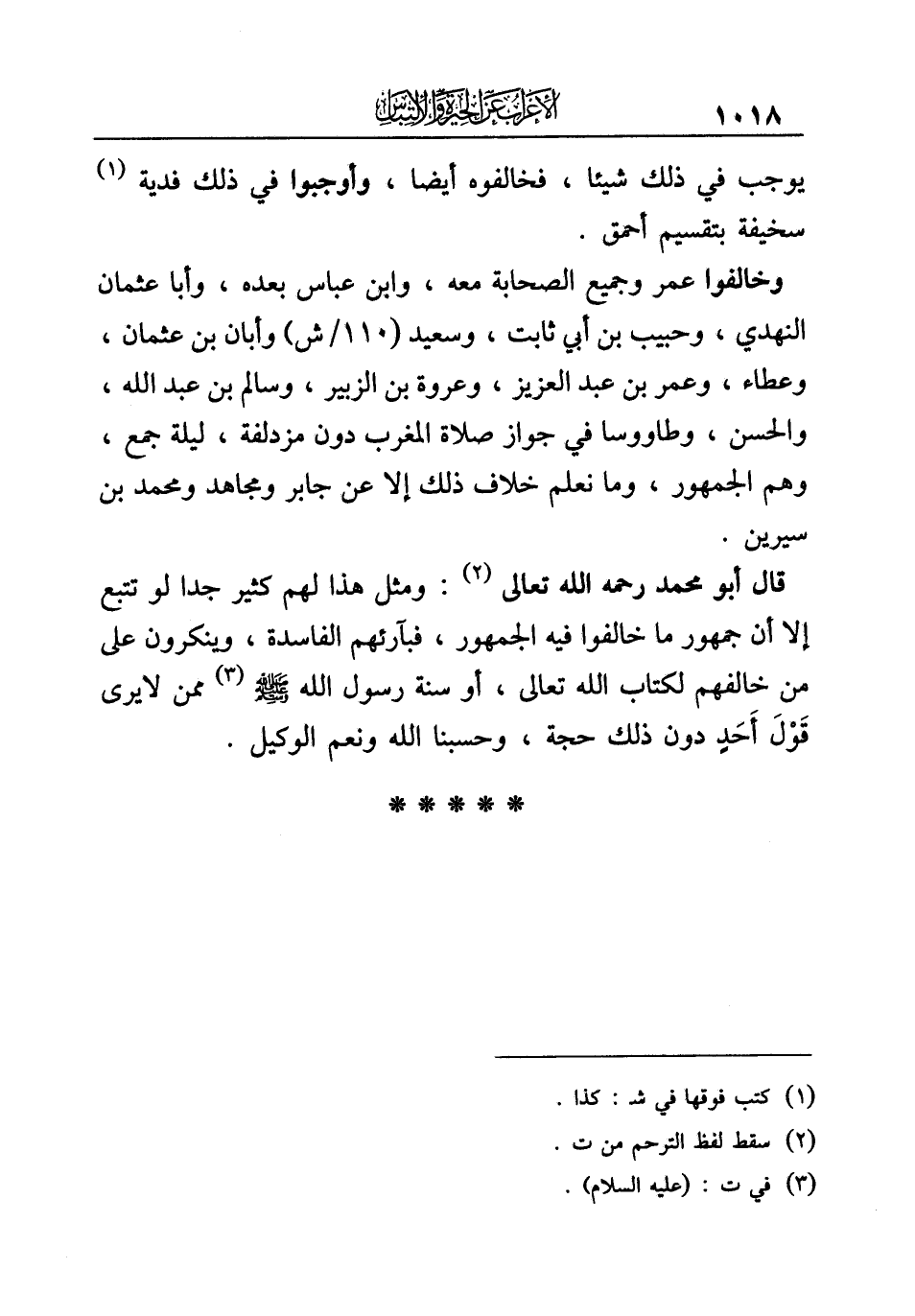 قال أبو محمد رحمه الله تعالى (¬٢): ومثل هذا لهم كثير جدا لو تتبع إلا أن جمهور ما خالفوا فيه الجمهور، فبآرئهم الفاسدة، وينكرون على من خالفهم لكتاب الله تعالى، أو سنة رسول الله -صلى الله عليه وسلم- (¬٣) ممن لا يرى قَوْلَ أَحَدٍ دون ذلك حجة، وحسبنا الله ونعم الوكيل.