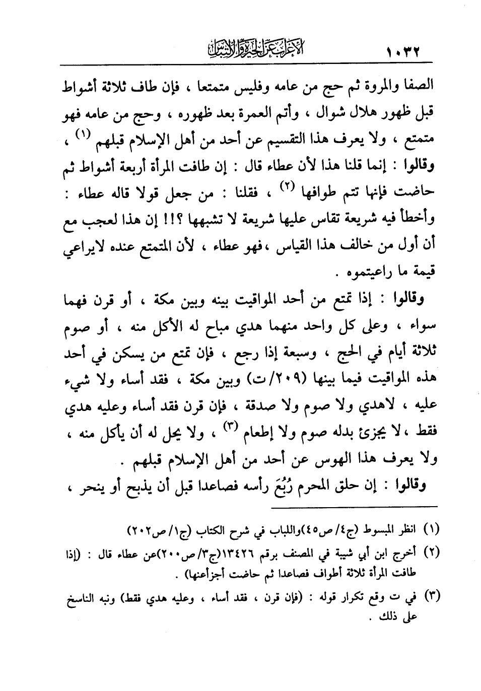 الصفا والمروة ثم حج من عامه وفليس متمتعا، فإن طاف ثلاثة أشواط قبل ظهور هلال شوال، وأتم العمرة بعد ظهوره، وحج من عامه فهو متمتع، ولا يعرف هذا التقسيم عن أحد من أهل الإسلام قبلهم (¬١)، وقالوا: إنما قلنا هذا لأن عطاء قال: إن طافت المرأة أربعة أشواط ثم حاضت فإنها تتم طوافها (¬٢)، فقلنا: من جعل قولا قاله عطاء: وأخطأ فيه شريعة تقاس عليها شريعة لا تشبهها؟ ! ! إن هذا لعجب مع أن أول من خالف هذا القياس، فهو عطاء، لأن المتمتع عنده لا يراعي قيمة ما راعيتموه.