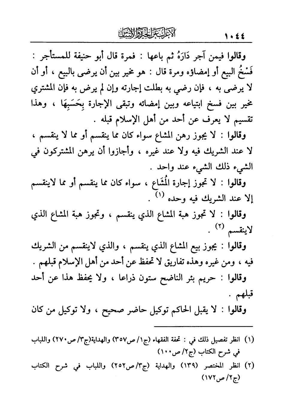 (¬٢) انظر المختصر (١٣٩) والهداية (ج ٣/ ص ٢٥٢) واللباب في شرح الكتاب (ج ٢/ ص ١٧٢).