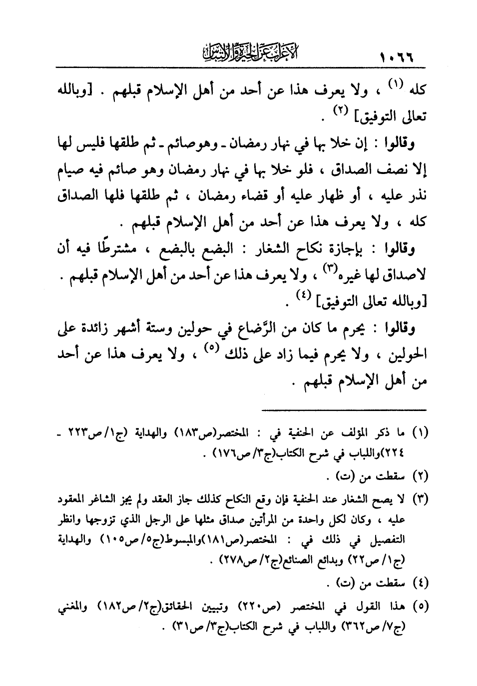 (¬٥) هذا القول في المختصر (ص ٢٢٠) وتبيين الحقائق (ج ٢/ ص ١٨٢) والمغني (ج ٧/ ص ٣٦٢) واللباب في شرح الكتاب (ج ٣/ ص ٣١).