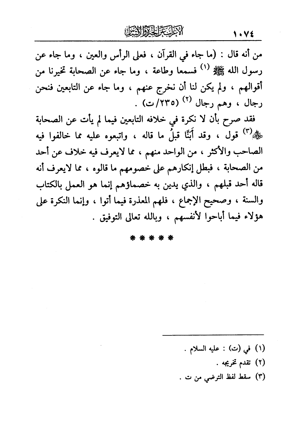 فقد صرح بأن لا نكرة في خلافه التابعين فيما لم يأت عن الصحابة -رضي الله عنهم- (¬٣) قول، وقد أَبَنَّا قبلُ ما قاله، واتبعوه عليه مما خالفوا فيه الصاحب والأكثر، من الواحد منهم، مما لا يعرف فيه خلاف عن أحد من الصحابة، فبطل إنكارهم على خصومهم ما قالوه، مما لا يعرف أنه قاله أحد قبلهم، والذي بدين به خصماؤهم إنما هو العمل بالكتاب والسنة، وصحيح الإجماع، فلهم المعذرة فيما أتوا، وإنما النكرة على هؤلاء فيما أباحوا لأنفسهم، وبالله تعالى التوفيق.