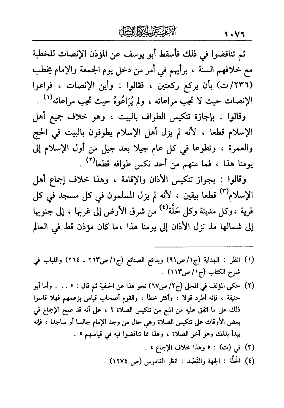وقالوا: بجواز تنكيس الأذان والإقامة، وهذا خلاف إجماع أهل الإسلام (¬٣) قطعا بيقين، لأنه لم يزل المسلمون في كل مسجد في كل قرية، وكل مدينة وكل حَلَّة (¬٤) من شرق الأرض إلى غربها، إلى جنوبها إلى شمالها مذ نزل الأذان إلى يومنا هذا، ما كان مؤذن قط في العالم