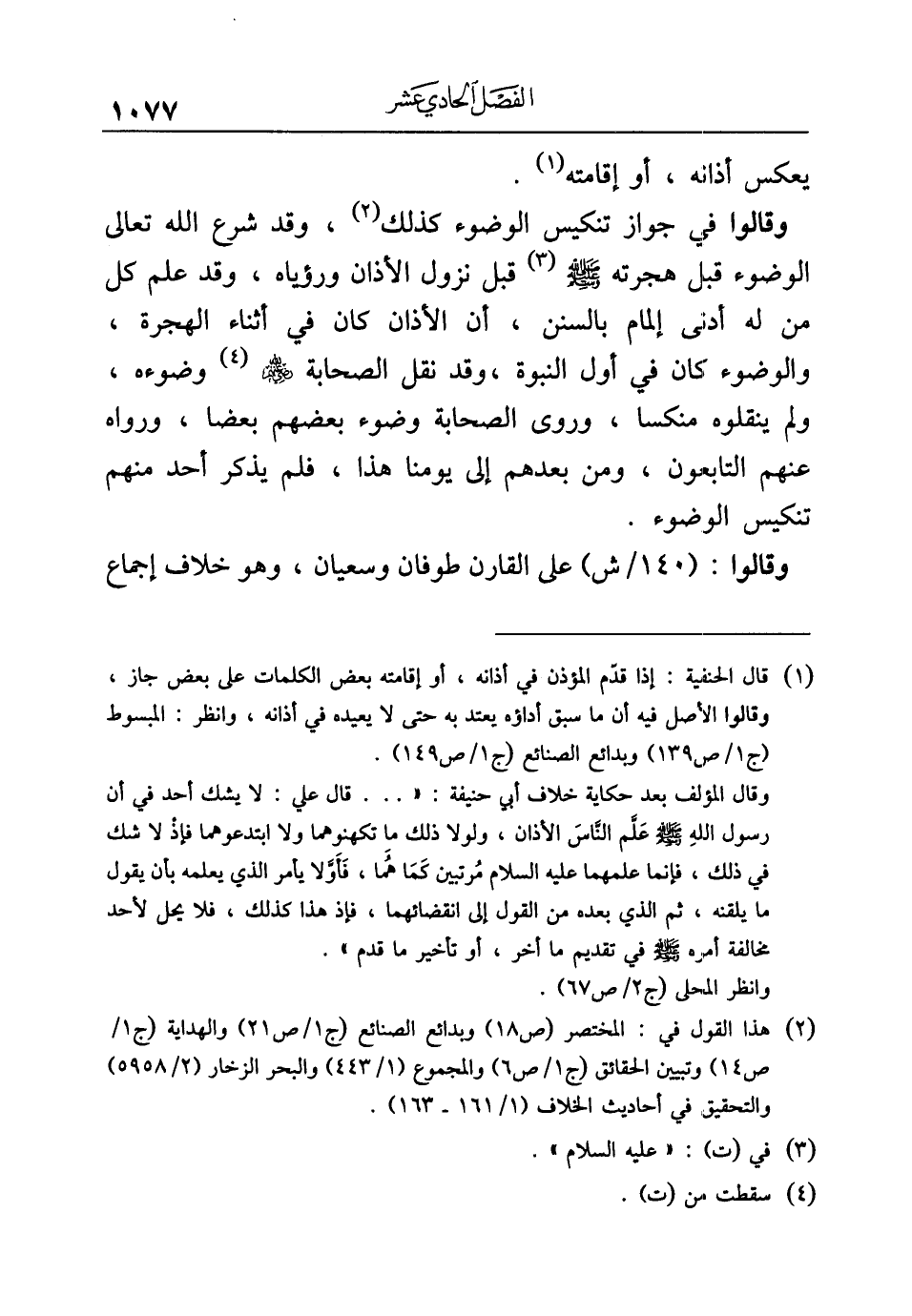 وقالوا في جواز تنكيس الوضوء كلذلك (¬٢)، وقد شرع الله تعالى الوضوء قبل هجرته -صلى الله عليه وسلم- (¬٣) قبل نزول الأذان ورؤياه، وقد علم كل من له أدنى إلمام بالسنن، أن الأذان كان في أثناء الهجرة، والوضوء كان في أول النبوة، وقد نقل الصحابة -رضي الله عنهم- (¬٤) وضوءه، ولم ينقلوه منكسا، وروى الصحابة وضوء بعضهم بعضا، ورواه عنهم التابعون، ومن بعدهم إلى يومنا هذا، فلم يذكر أحد منهم تنكيس الوضوء.