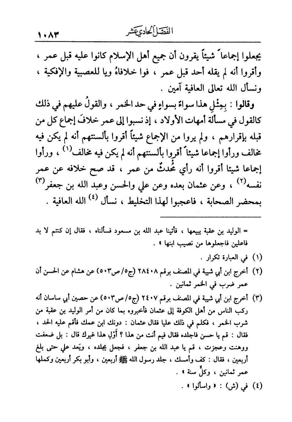 (¬٣) أخرج ابن أبي شيبة في المصنف برقم ٢٤٠٧ (ج ٥/ ص ٥٠٣) عن حصين أبي ساسان أنه ركب الناس من أهل الكوفة إلى عثمان فأخبروه بما كان من أمر الوليد بن عقبة من شرب الخمر، فكلم في ذلك عليا فقال عثمان: دونك ابن عمك فأقم عليه الحد، فقال: قم يا حسن فاجلده فقال فيم أنت من هذا؟ أَوْلِ هذا غيرك قال: بل ضعفت ووهنت وعجزت، قم يا عبد الله بن جعفر، فجعل يجلده، ويَعد علي حتى بلغ أربعين، فقال: كف وأمسك، جلد رسول الله -صلى الله عليه وسلم- أربعين، وأبو بكر أربعين وكملها عمر ثمانين، وكلُّ سنة".