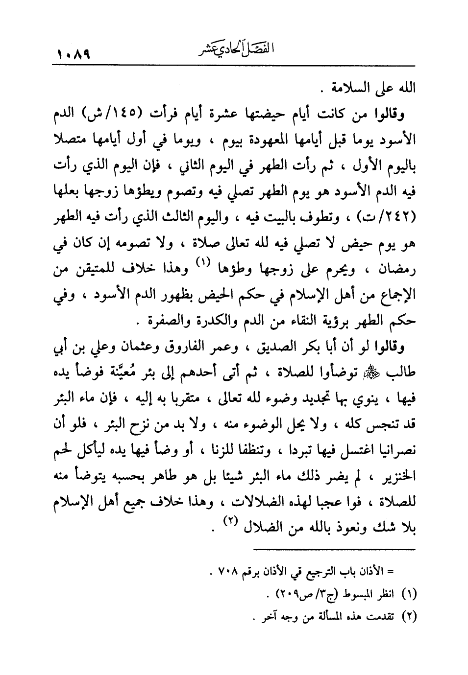 وقالوا لو أن أبا بكر الصديق، وعمر الفاروق وعثمان وعلي بن أبي طالب -رضي الله عنهم- توضأوا للصلاة، ثم أتى أحدهم إلى بئر مُعيَّنة فوضأ يده فيها، ينوي بها تجديد وضوء لله تعالى، متقربا به إليه، فإن ماء البئر قد تنجس كله، ولا يحل الوضوء منه، ولا بد من نزح البئر، فلو أن نصرانيا اغتسل فيها تبردا، وتنظفا للزنا، أو وضأ فيها يده ليأكل لحم الخنزير، لم يضر ذلك ماء البئر شيئا بل هو طاهر بحسبه يتوضأ منه للصلاة، فواعجبا لهذه الضلالات، وهذا خلاف جميع أهل الإسلام بلا شك ونعوذ بالله من الضلال (¬٢).