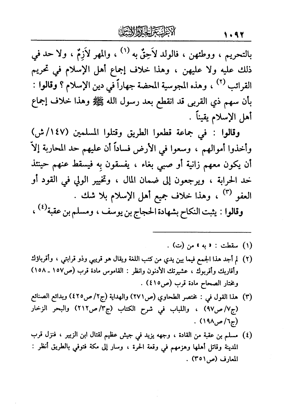 بالتحريم، ووطئهن، فالولد لَاحِقٌ به (¬١)، والمهر لَازِمٌ، ولا حد في ذلك عليه ولا عليهن، وهذا خلاف إجماع أهل الإسلام في تحريم القرائب (¬٢)، وهذه المجوسية المحضة جهارًا في دين الإسلام؟ وقالوا: بأن سهم ذي القربى قد انقطع بعد رسول الله -صلى الله عليه وسلم- وهذا خلاف إجماع أهل الإسلام يقينًا.