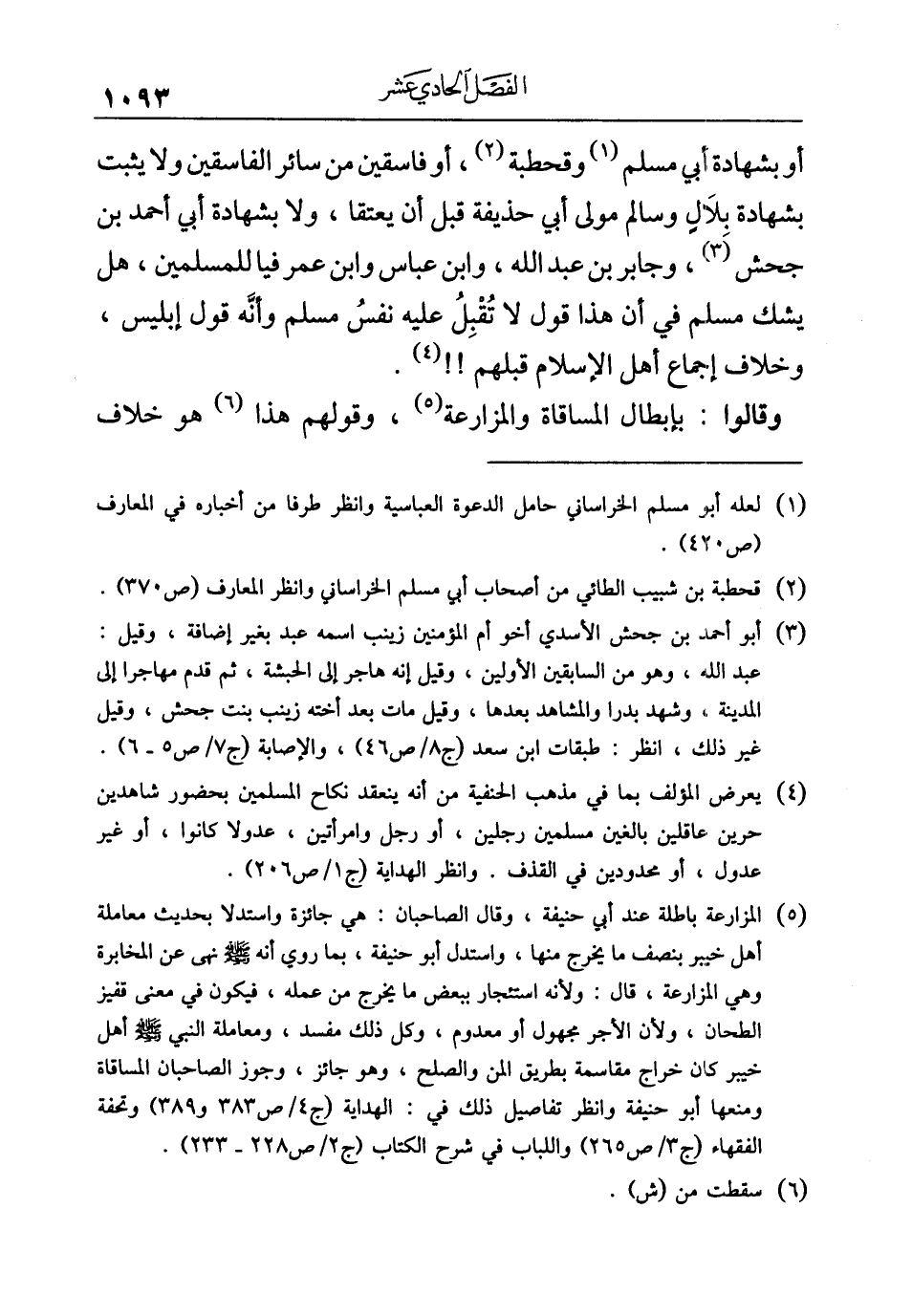 أو بشهادة أبي مسلم (¬١) وقحطبة (¬٢)، أو فاسقين من سائر الفاسقين ولا يثبت بشهادة بِلَالٍ وسالم مولى أبي حذيفة قبل أن يعتقا، ولا بشهادة أبي أحمد بن جحش (¬٣)، وجابر بن عبد الله، وابن عباس وابن عمر فيا للمسلمين، هل يشك مسلم في أن هذا قول لا تُقْبِلُ عليه نفسُ مسلم وأنَّه قول إبليس، وخلاف إجماع أهل الإسلام قبلهم! ! (¬٤).