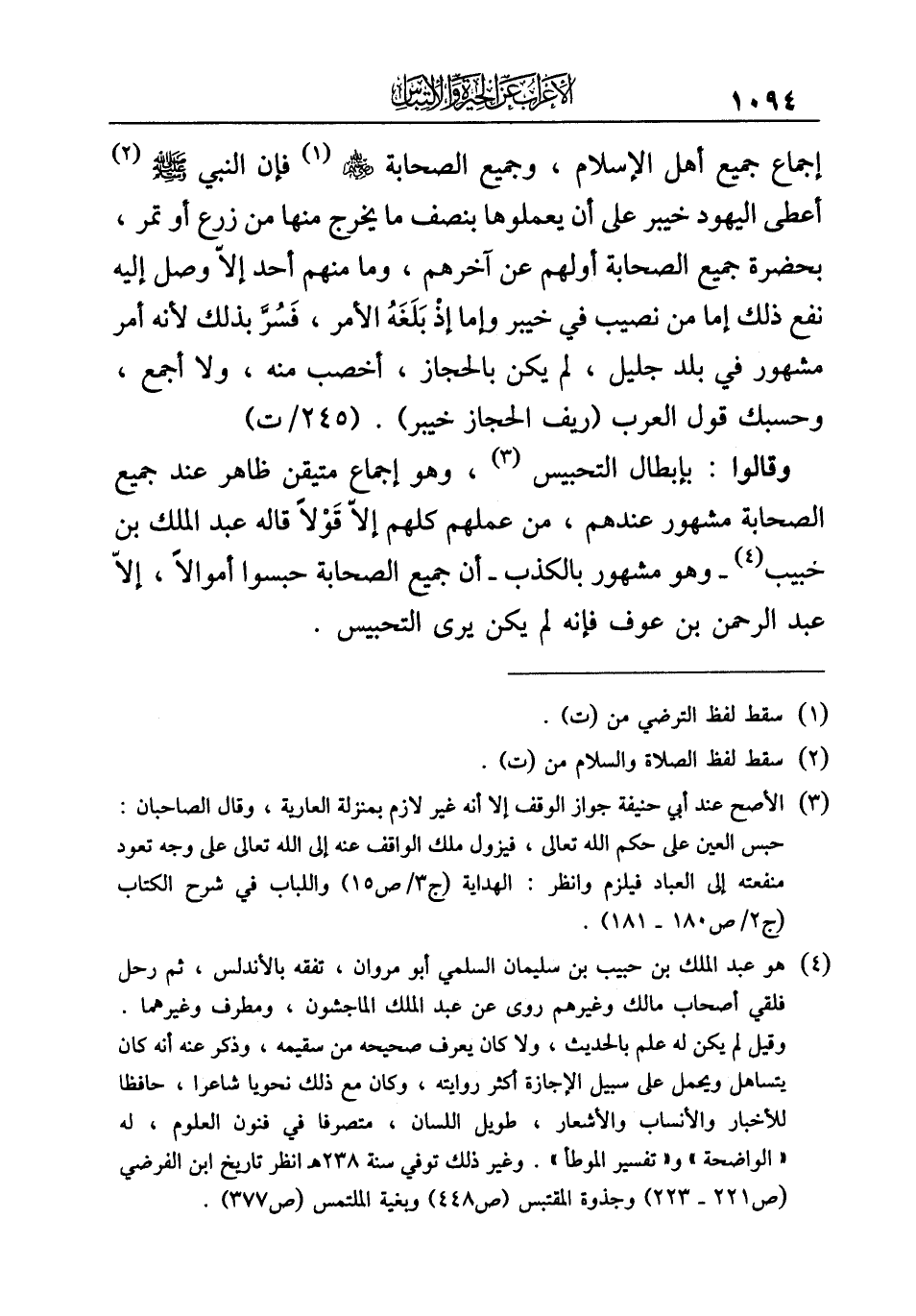 وقالوا: بإبطال التحبيس (¬٣)، وهو إجماع متيقن ظاهر عند جميع الصحابة مشهور عندهم، من عملهم كلهم إلّا قَوْلًا قاله عبد الملك بن خبيب (¬٤) -وهو مشهور بالكذب- أن جميع الصحابة حبسوا أموالًا، إلّا عبد الرحمن بن عوف فإنه لم يكن يرى التحبيس.