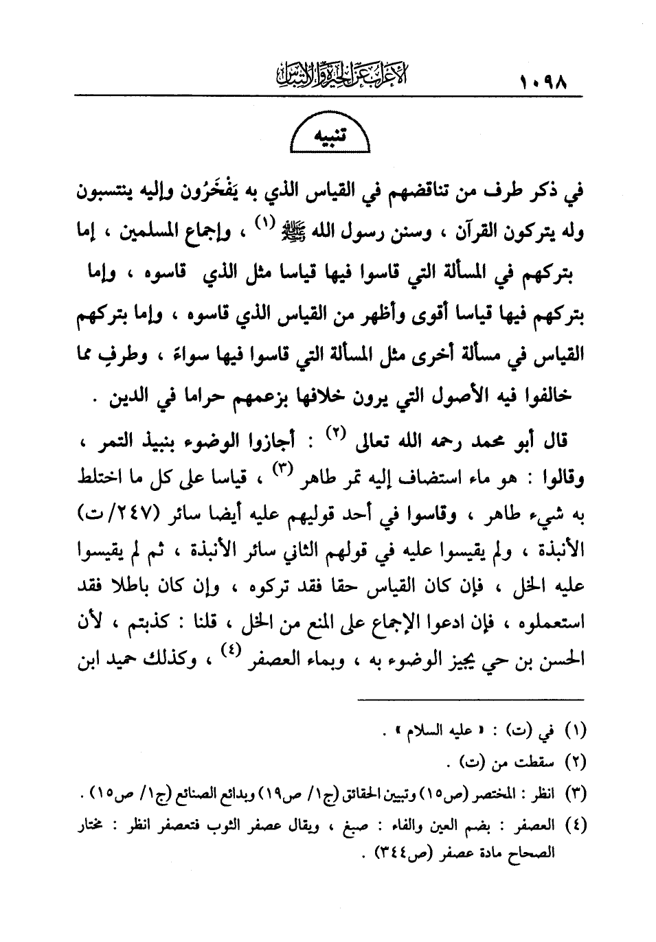 قال أبو محمد رحمه الله تعالى (¬٢): أجازوا الوضوء بنبيذ التمر، وقالوا: هو ماء استضاف إليه تمر طاهر (¬٣)، قياسا على كل ما اختلط به شيء طاهر، وقاسوا في أحد قوليهم عليه أيضا سائر الأنبذة، ولم يقيسوا عليه في قولهم الثاني سائر الأنبذة، ثم لم يقيسوا عليه الخل، فإن كان القياس حقا فقد تركوه، وإن كان باطلا فقد استعملوه، فإن ادعوا الإجماع على المنع من الخل، قلنا: كذبتم، لأن الحسن بن حي يجيز الوضوء به، وبماء العصفر (¬٤)، وكذلك حميد ابن