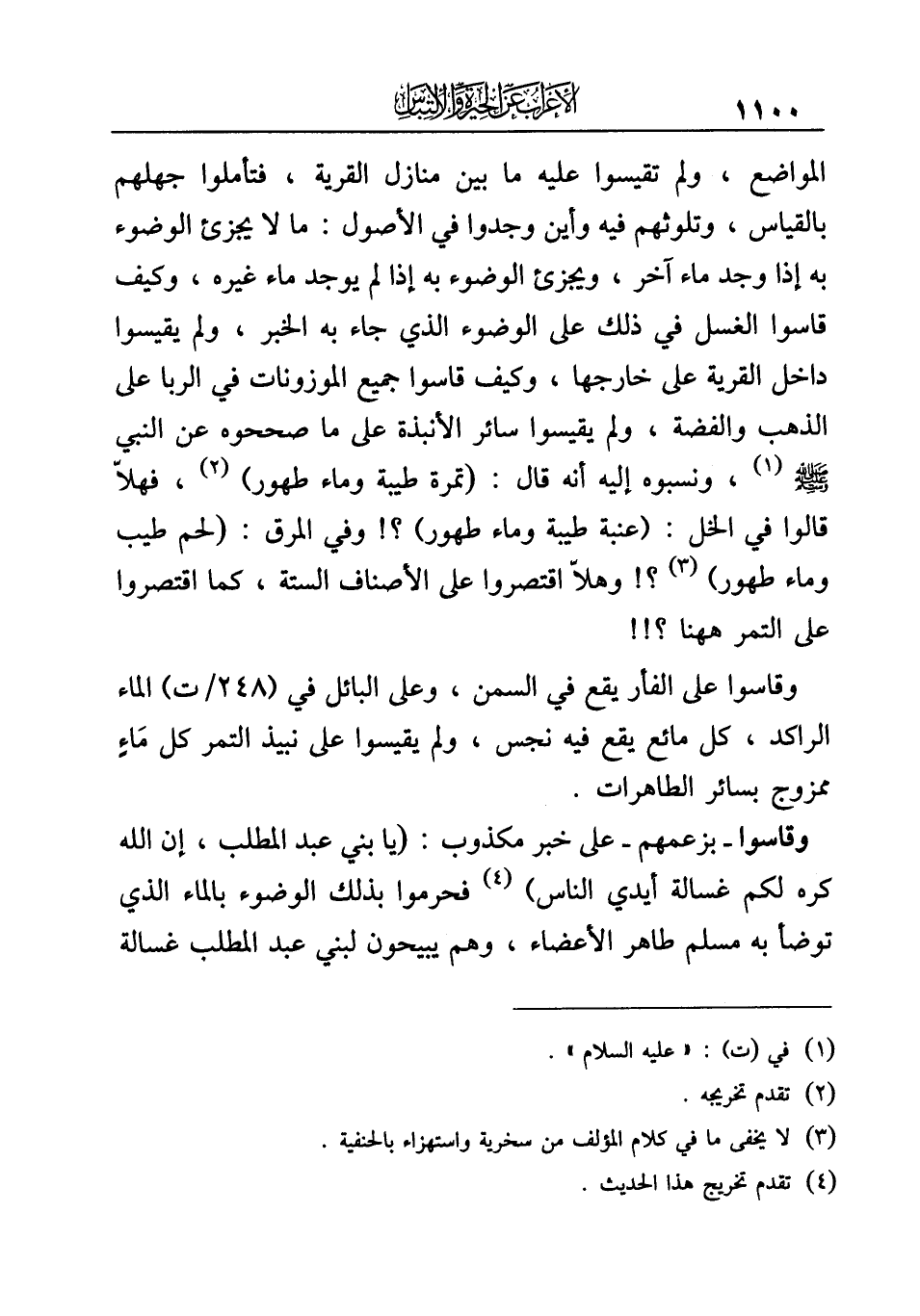 وقاسوا -بزعمهم- على خبر مكذوب: (يا بني عبد المطلب، إن الله كره لكم غسالة أيدي الناس) (¬٤) فحرموا بذلك الوضوء بالماء الذي توضأ به مسلم طاهر الأعضاء، وهم يبيحون لبني عبد المطلب غسالة