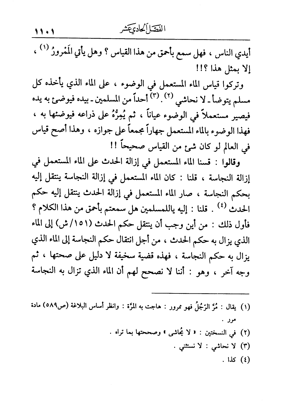 وقالوا: قسنا الماء المستعمل في إزالة الحدث على الماء المستعمل في إزالة النجاسة، قلنا: كان الماء المستعمل في إزالة النجاسة ينتقل إليه بحكم النجاسة، صار الماء المستعمل في إزالة الحدث ينتقل إليه حكم الحدث (¬٤). قلنا: إليه يا للمسلمين هل سمعتم بأحمق من هذا الكلام؟ فأول ذلك: من أين وجب أن ينتقل حكم الحدث إلى الماء الذي يزال به حكم الحدث، من أجل انتقال حكم النجاسة إلى الماء الذي يزال به حكم النجاسة، فهذه قضية سخيفة لا دليل على صحتها، ثم وجه آخر، وهو: أننا لا نصحح لهم أن الماء الذي تزال به النجاسة