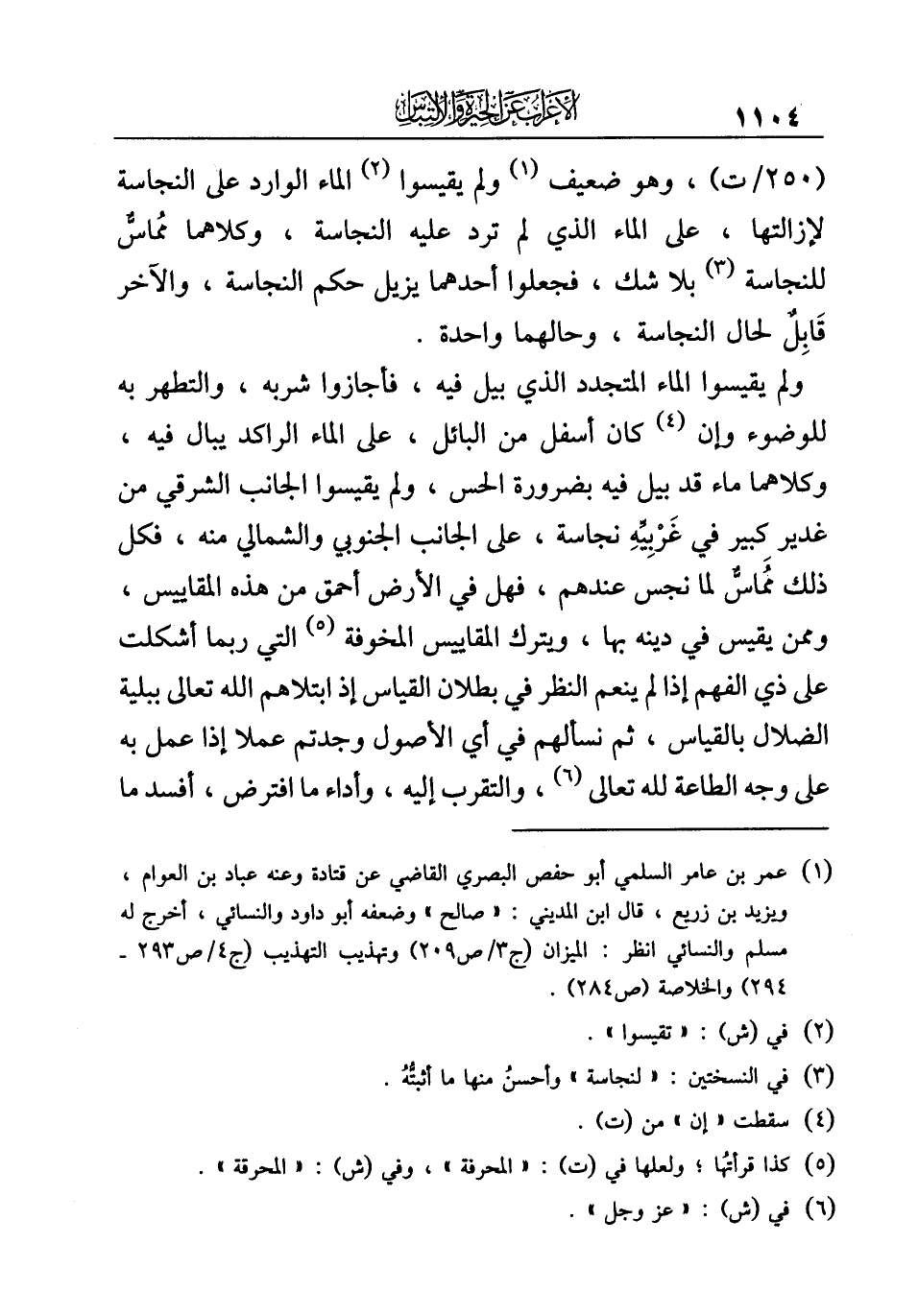 ولم يقيسوا الماء المتجدد الذي بيل فيه، فأجازوا شربه، والتطهر به للوضوء وإن (¬٤) كان أسفل من البائل، على الماء الراكد يبال فيه، وكلاهما ماء قد بيل فيه بضرورة الحس، ولم يقيسوا الجانب الشرقي من غدير كبير في غَرْبِيِّهِ نجاسة، على الجانب الجنوبي والشمالي منه، فكل ذلك مُماسٌّ لما نجس عندهم، فهل في الأرض أحمق من هذه المقاييس، وممن يقيس في دينه بها، ويترك المقاييس المخوفة (¬٥) التي ربما أشكلت على ذي الفهم إذا لم ينعم النظر في بطلان القياس إذ ابتلاهم الله تعالى ببلية الضلال بالقياس، ثم نسألهم في أي الأصول وجدتم عملا إذا عمل به على وجه الطاعة لله تعالى (¬٦)، والتقرب إليه، وأداء ما افترض، أفسد ما