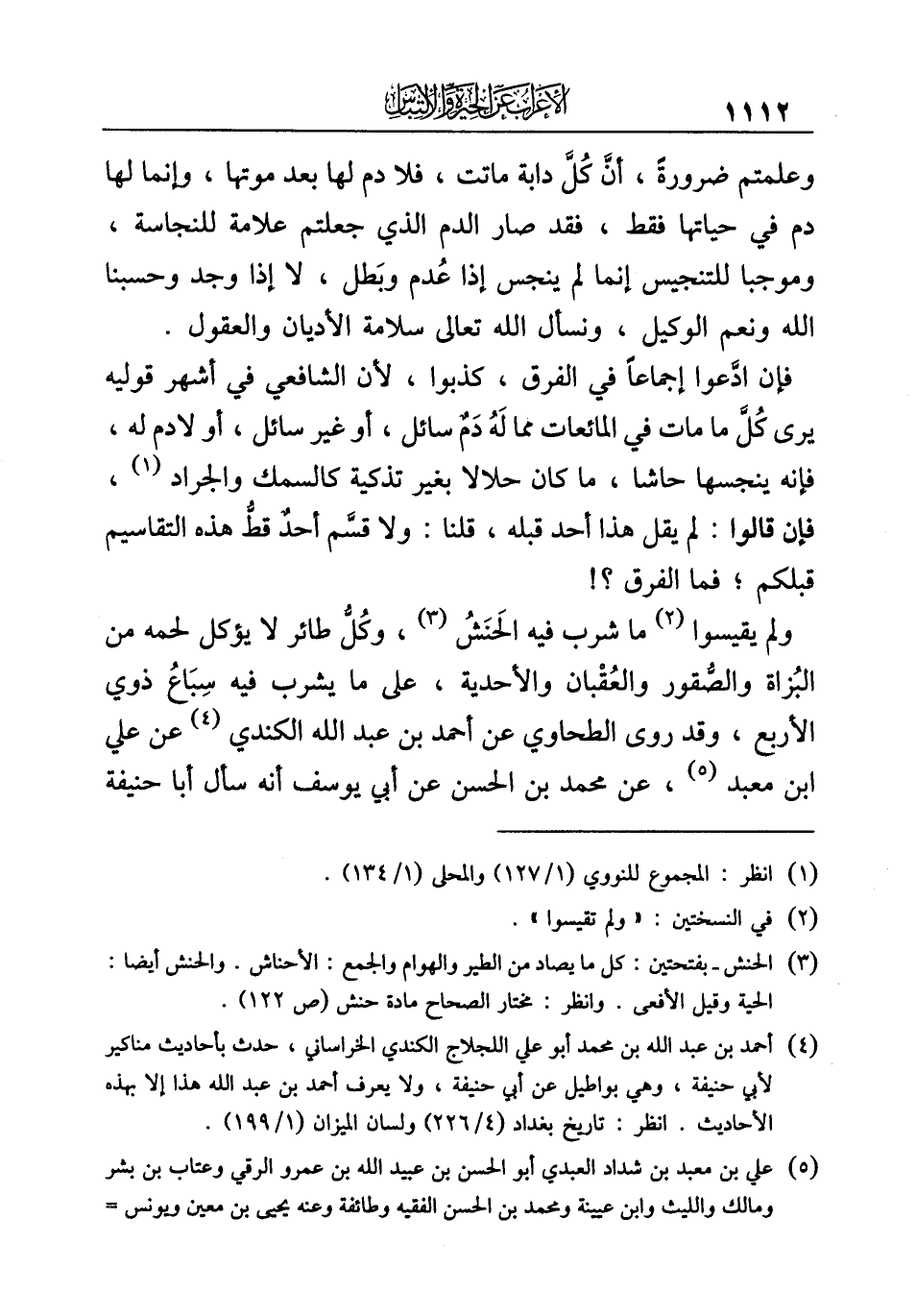 وعلمتم ضرورةً، أنَّ كُلَّ دابة ماتت، فلا دم لها بعد موتها، وإنما لها دم في حياتها فقط، فقد صار الدم الذي جعلتم علامة للنجاسة، وموجبا للتنجيس إنما لم ينجس إذا عُدم وبَطل، لا إذا وجد وحسبنا الله ونعم الوكيل، ونسأل الله تعالى سلامة الأديان والعقول.