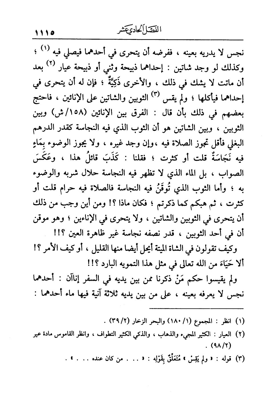 نجس لا يدريه بعينه، ففرضه أن يتحرى في أحدهما فيصلي فيه (¬١)؛ وكذلك لو وجد شاتين: إحداهما ذبيحة وثني أو ذبيحة عيار (¬٢) بعد أن ماتت لا يشك في ذلك، والأخرى ذَكِيَّةٌ؛ فإن له أن يتحرى في إحداهما فيأكلها؛ ولم يقس (¬٣) الثوبين والشاتين على الإنائين، فاحتج بعضهم في ذلك بأن قال: الفرق بين الإنائين وبين الثوبين، وبين الشاتين هو أن الثوب الذي فيه النجاسة كقدر الدرهم البغلي فأقل تجوز الصلاة فيه، وإن وجد غيره، ولا يجوز الوضوء بِمَاءٍ فيه نَجَاسَةٌ قلت أو كثرت؛ فقلنا: كَذَبَ قائلُ هذا، وعَكَسَ الصواب، بل الماء الذي لا تظهر فيه النجاسة حلال شربه والوضوء به؛ وأما الثوب الذي تُوقَنُ فيه النجاسة فالصلاة فيه حرام قلت أو كثرت، ثم هبكم كما ذكرتم؛ فكان ماذا؟ ! ومن أين وجب من ذلك أن يتحرى في الثوبين والشاتين، ولا يتحرى في الإناءين؛ وهو موقن أن في أحد الثوبين، قدر نصفه نجاسة غير ظاهرة العين؟ ! !