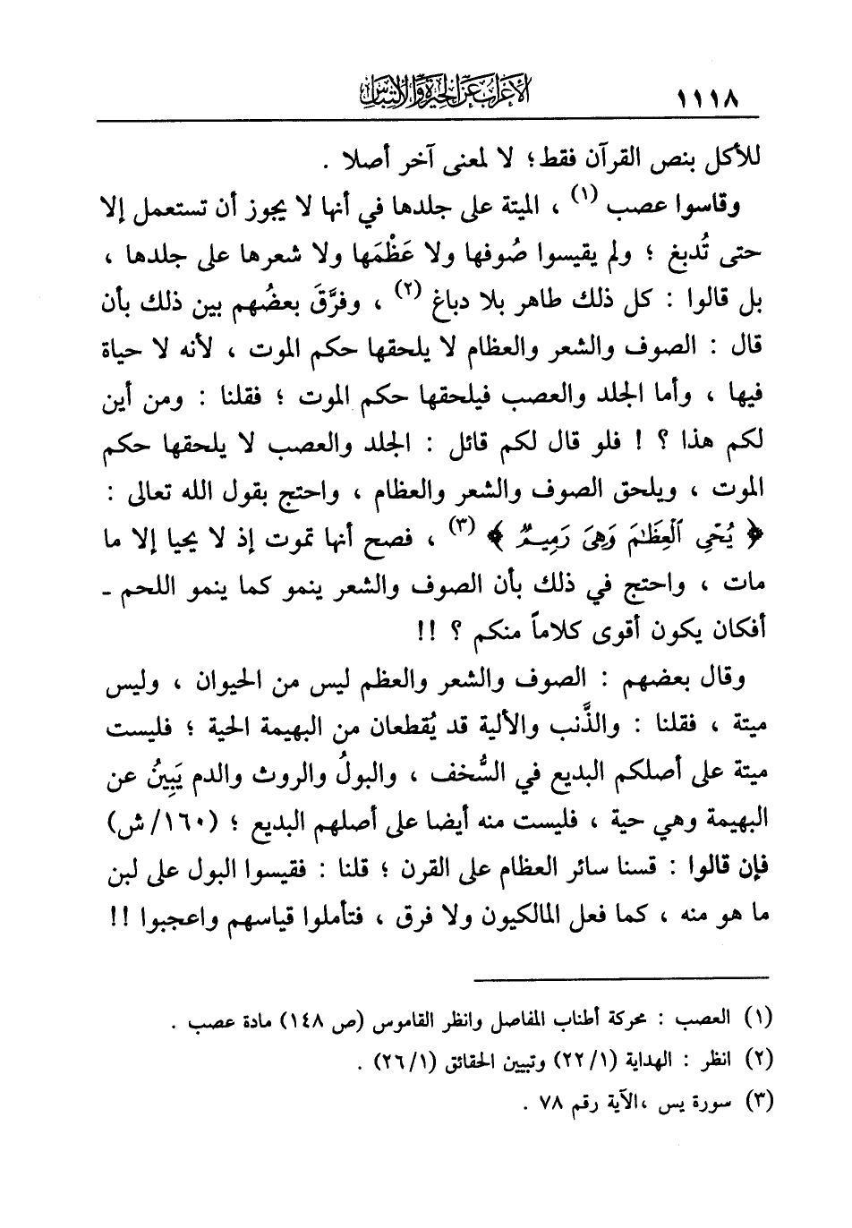 وقال بعضهم: الصوف والشعر والعظم ليس من الحيوان، وليس ميتة، فقلنا: والذَّنب والألية قد يُقطعان من البهيمة الحية؛ فليست ميتة على أصلكم البديع في السُّخف، والبولُ والروث والدم يَبِينُ عن البهيمة وهي حية، فليست منه أيضا على أصلهم البديع؛ فإن قالوا: قسنا سائر العظام على القرن؛ قلنا: فقيسوا البول على لبن ما هو منه، كما فعل المالكيون ولا فرق، فتأملوا قياسهم واعجبوا! !