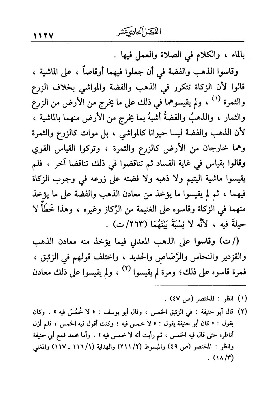 (¬٢) قال أبو حنيفة: في الزئبق الخمس، وقال أبو يوسف: "لا خُمُسَ فيه". وكان يقول: "كان أبو حنيفة يقول: "لا خمس فيه؛ وكنت أقول فيه الخمس، فلم أزل أناظره حتى قال فيه الخمس، ثم رأيت أنه لا خمس فيه". وأما محمد فمع أبي حنيفة وانظر: المختصر (ص ٤٩) والمبسوط (٢/ ٢١١) والهداية (١/ ١١٦ - ١١٧) والمغني (٣/ ١٨).
