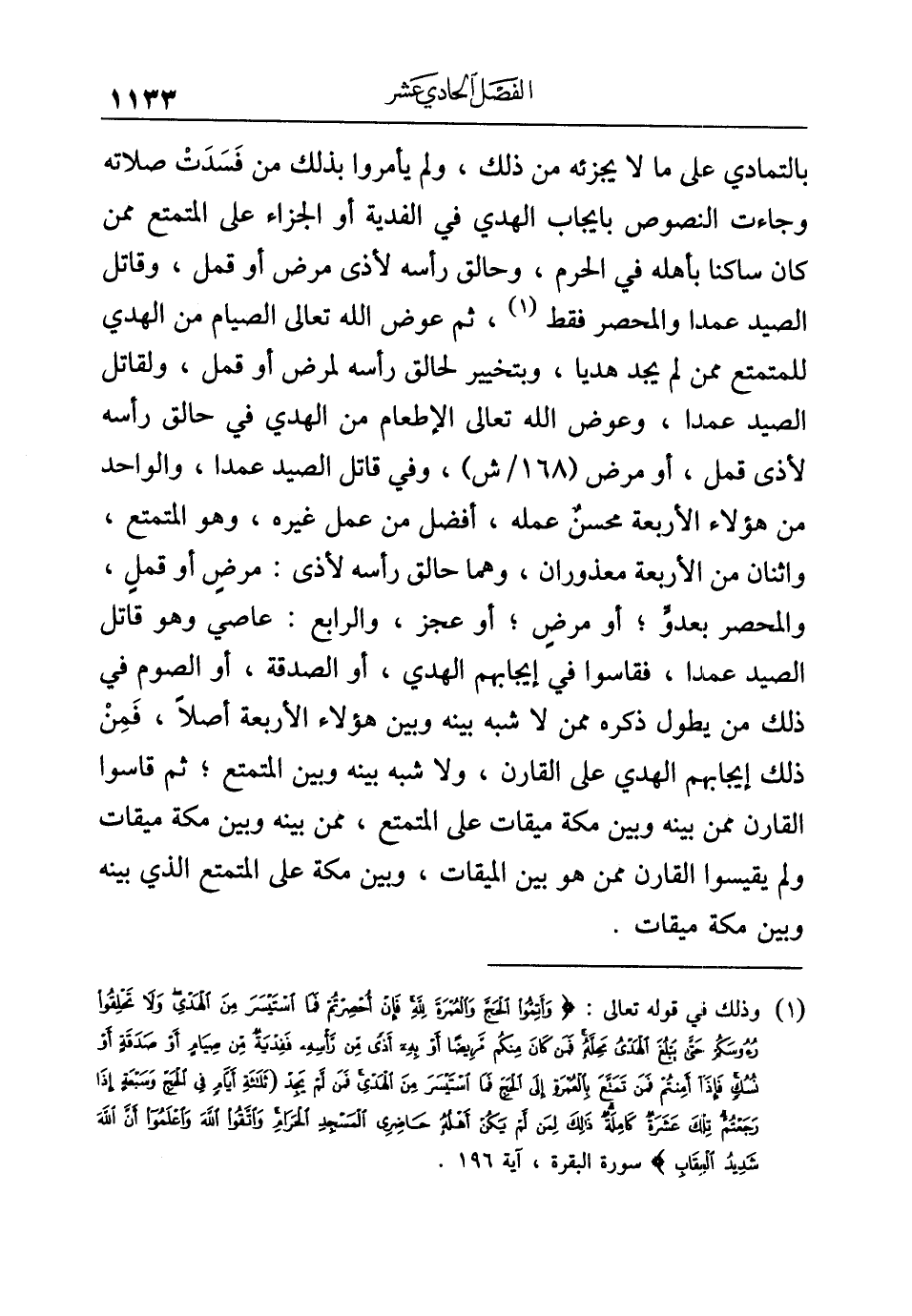 (¬١) وذلك في قوله تعالى: {وَأَتِمُّوا الْحَجَّ وَالْعُمْرَةَ لِلَّهِ فَإِنْ أُحْصِرْتُمْ فَمَا اسْتَيْسَرَ مِنَ الْهَدْيِ وَلَا تَحْلِقُوا رُءُوسَكُمْ حَتَّى يَبْلُغَ الْهَدْيُ مَحِلَّهُ فَمَنْ كَانَ مِنْكُمْ مَرِيضًا أَوْ بِهِ أَذًى مِنْ رَأْسِهِ فَفِدْيَةٌ مِنْ صِيَامٍ أَوْ صَدَقَةٍ أَوْ نُسُكٍ فَإِذَا أَمِنْتُمْ فَمَنْ تَمَتَّعَ بِالْعُمْرَةِ إِلَى الْحَجِّ فَمَا اسْتَيْسَرَ مِنَ الْهَدْيِ فَمَنْ لَمْ يَجِدْ فَصِيَامُ ثَلَاثَةِ أَيَّامٍ فِي الْحَجِّ وَسَبْعَةٍ إِذَا رَجَعْتُمْ تِلْكَ عَشَرَةٌ كَامِلَةٌ ذَلِكَ لِمَنْ لَمْ يَكُنْ أَهْلُهُ حَاضِرِي الْمَسْجِدِ الْحَرَامِ وَاتَّقُوا اللَّهَ وَاعْلَمُوا أَنَّ اللَّهَ شَدِيدُ الْعِقَابِ} سورة البقرة، آية ١٩٦.